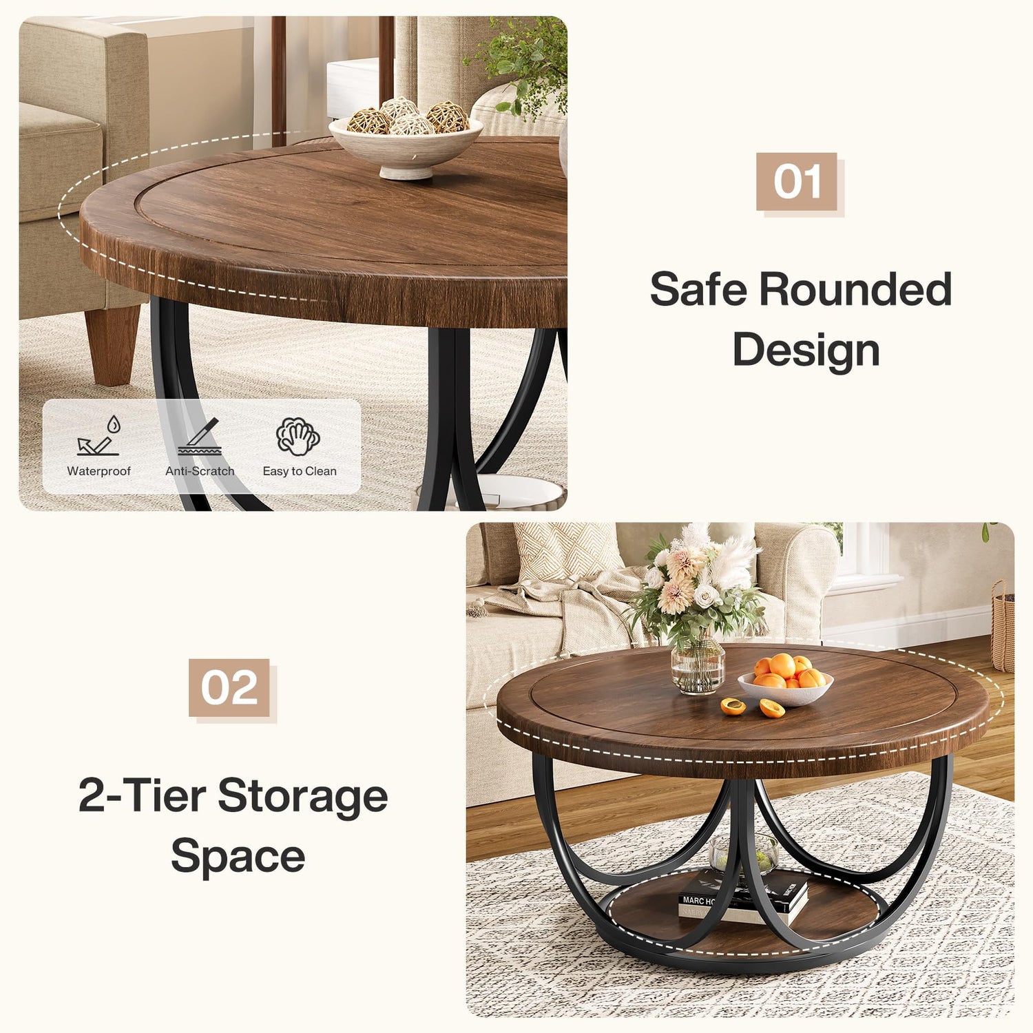 • 2-Tier Storage Design: This round coffee table features a spacious 31.5-inch diameter tabletop for drinks and décor, with a lower shelf for books, remotes, or magazines. A practical storage coffee table that keeps your living room organized