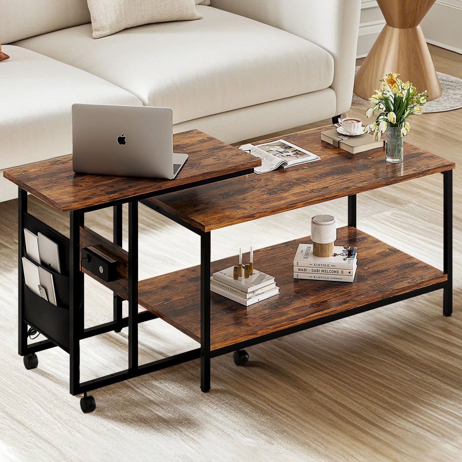 VECELO Coffee Table Set of 2 - Adjustable Height with USB Ports & Wheels, 31.5" and 20" Side and End Tables for Living Room, Bedroom, Apartment, Industrial Style, Rustic Brown
