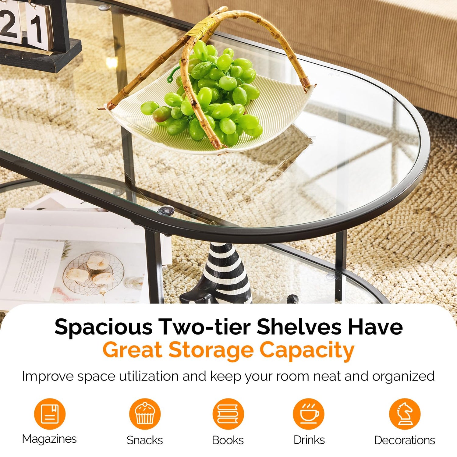 - Abundant Storage Function: The glass top coffee table adopts a double-layer design, providing powerful storage capacity to keep your living room tidy and organised.