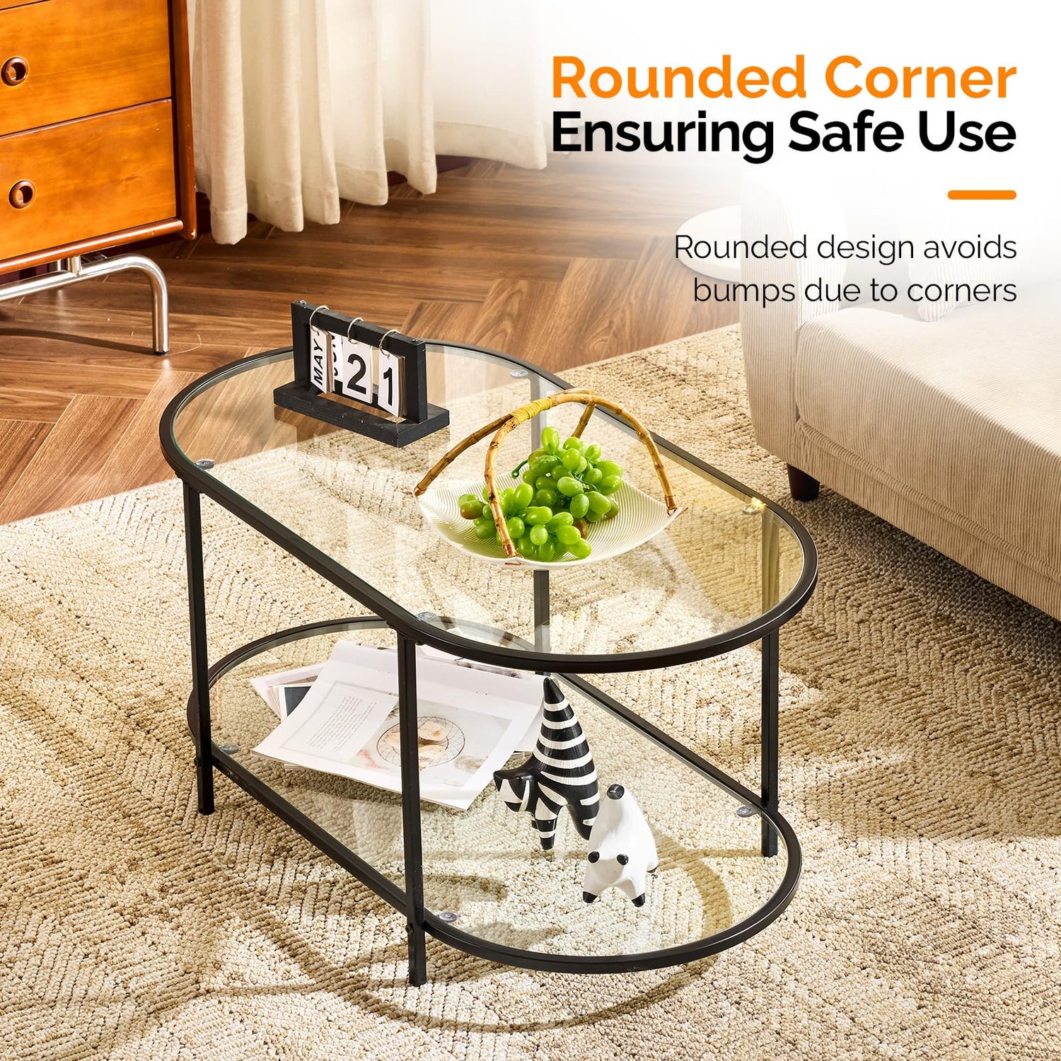 - Innovative Design: This small oval coffee table designs with transparent glass elements creates an elegant and fashionable appearance. The visualized glass both hassles you to access your items and visually provides you with a spacious and open feeling