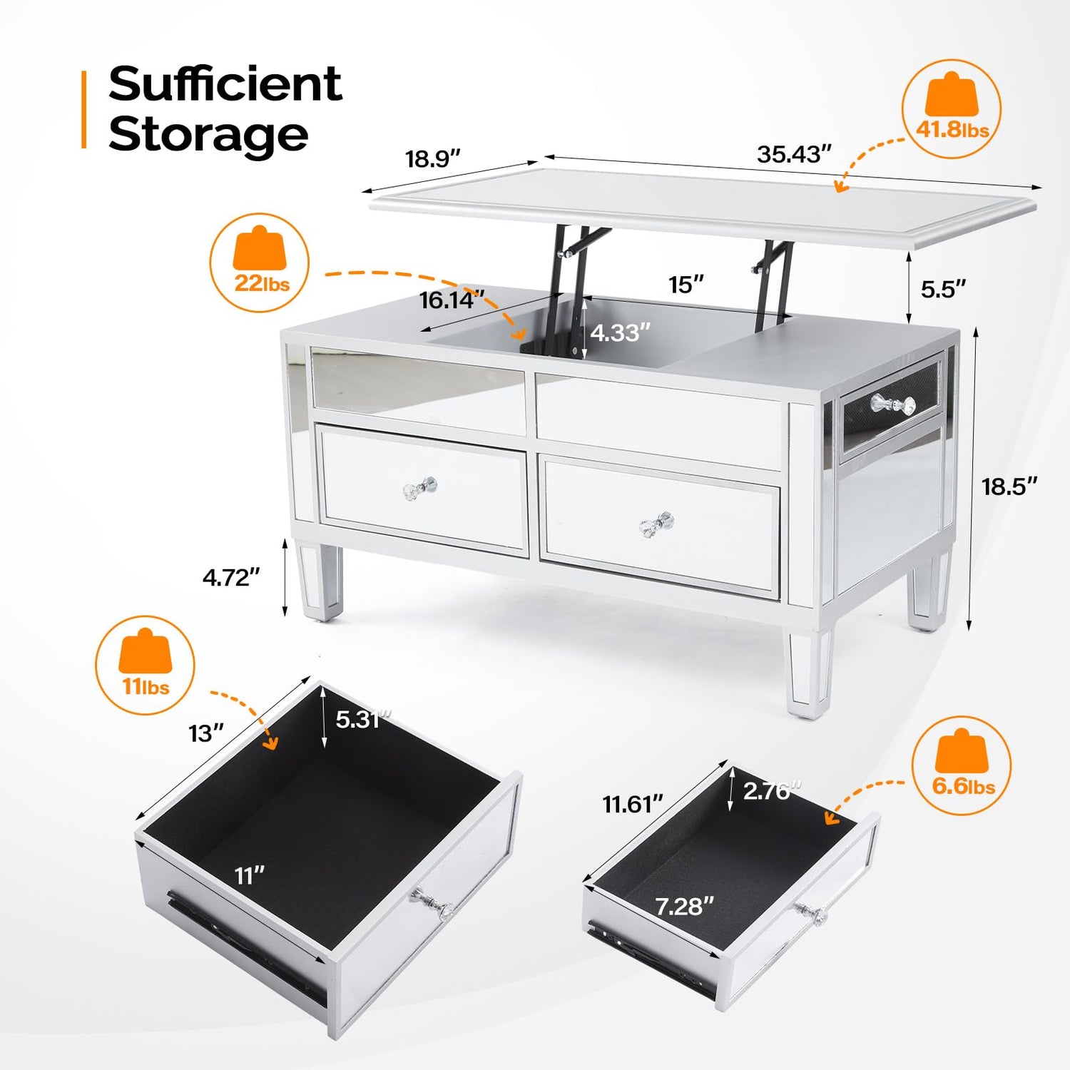 VINGLI Mirrored Lift Top Coffee Table, Assembled Modern Coffee Table with Drawers for Living Room (Silver, 35'' x 19'' x 18'')