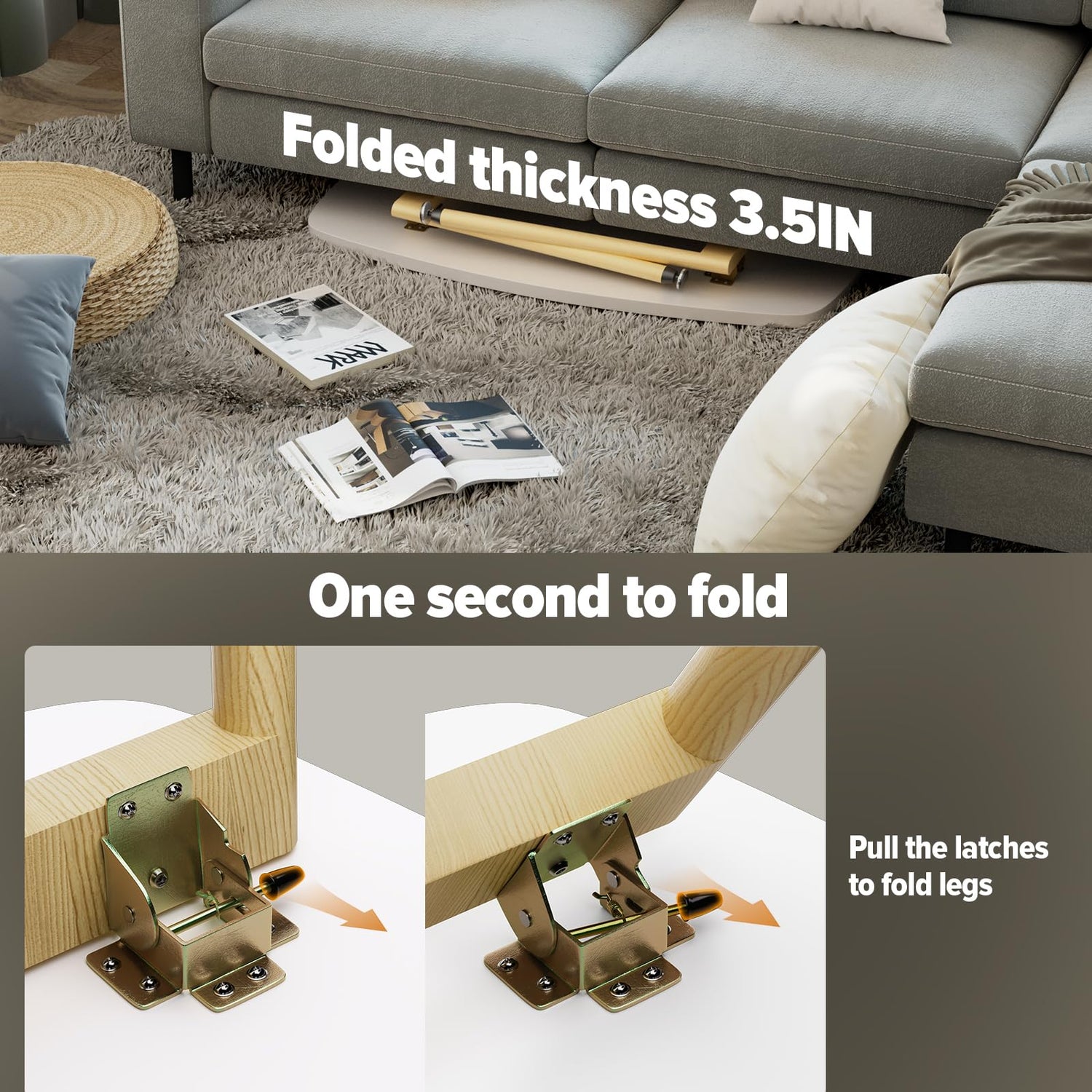 - Secure Leg Latches: The coffee tables has a locking function on the legs that effectively prevents the legs from accidentally folding inward and tipping over,enhancing safety and stability.It can be easily folded by pressing the latch