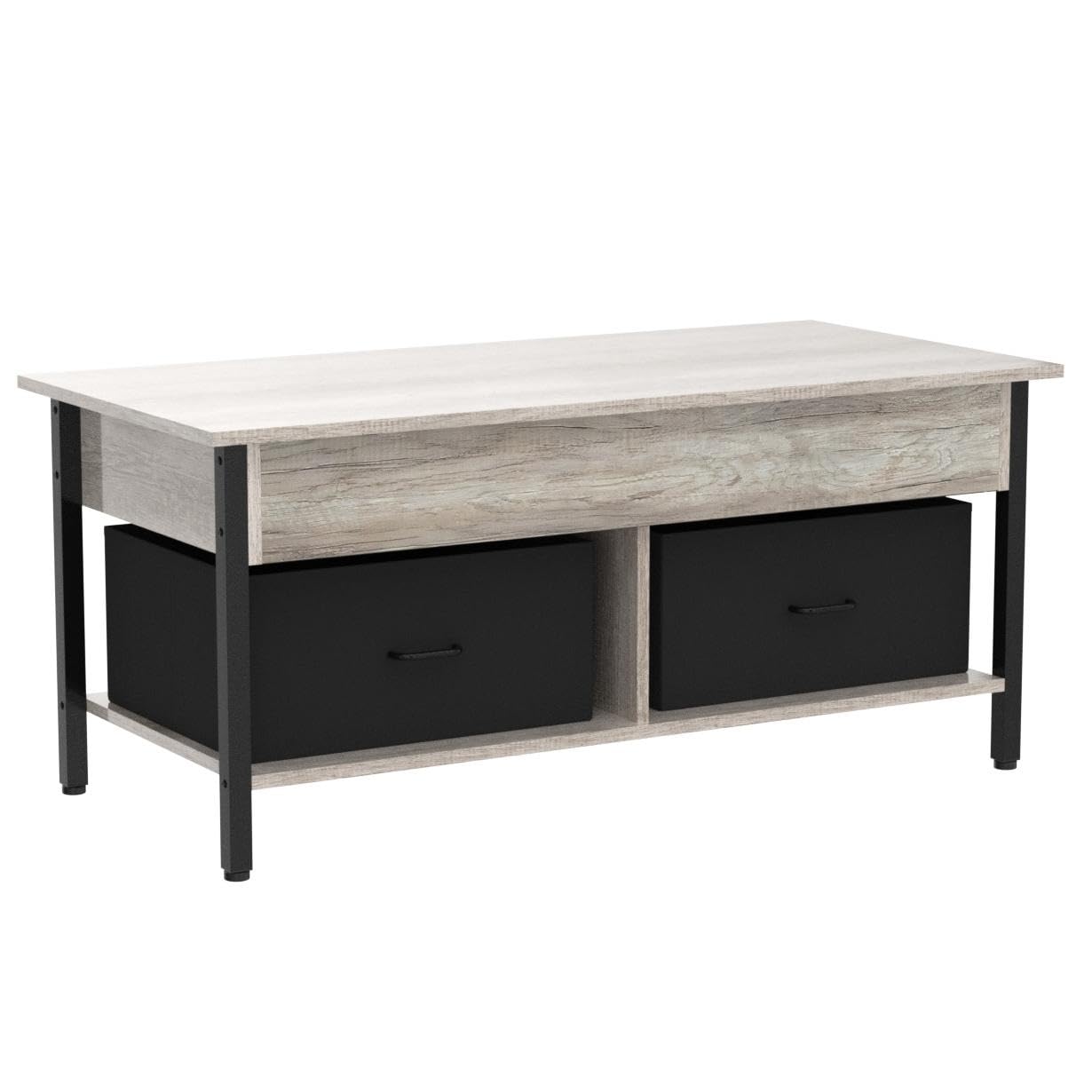Details: Specifications: Color: GrayMaterial: MDF, steel, non-woven fabricOverall Dimension (with tabletop down): 105 x 50 x 47cm / 41.5 x 20 x 18.5’’ (L x W x H)Extended Dimension (with tabletop up): 105 x 50 x 61.5 cm / 41.5 x 20 x 24.5’’ (L x W x H)Hidden Compartment Inner Size: 92 x 41 x 10.5 cm / 36.5 x 16 x 4’’ (L x W x D)Fabric Storage Basket Inner Size (each): 42 x 35 x 19.5 cm / 16.5 x 14 x 8’’ (L x W x D)Ground Clearance: 9.5cm / 3.7’’Max. Weight capacity: tabletop: 90 kg / 198 lb; hidden storage: 30 kg / 66 lb; fabric storage basket (each): 10 kg / 22 lbN.W.: 19kg / 42lbG.W.: 20.9kg / 46lbNote:1. Please allow ±1cm/0.5” errors due to manual measurements.2. For your safety, please do not stand on the tabletop. 3. Please be careful with your fingers when lifting/lowering the tabletop.This modern lift-top coffee table embodies the beauty of simple design and clean construction. Composed of fine wood grain veneer and black metal legs, it delivers a sense of both rustic charm and modern minimalist, compatible with any living area. Premium MDF board and robust steel frames form a stable and durable central table for multiple years of use.Specifications:Color: GrayMaterial: MDF, steel, non-woven fabricOverall Dimension (with tabletop down): 41.5 x 20 x 18.5’’ (L x W x H)Extended Dimension (with tabletop up): 41.5 x 20 x 24.5’’ (L x W x H)Hidden Compartment Inner Size: 36.5 x 16 x 4’’ (L x W x D)Fabric Storage Basket Inner Size (each): 16.5 x 14 x 8’’ (L x W x D)Ground Clearance: 3.7’’Max. Weight capacity: tabletop: 198 lb; hidden storage: 66 lb; fabric storage basket (each): 22 lbN.W.: 42lbG.W.: 46lb Package included:1 x Lift-top Coffee Table2 x Fabric Storage Baskets1 x Instructions