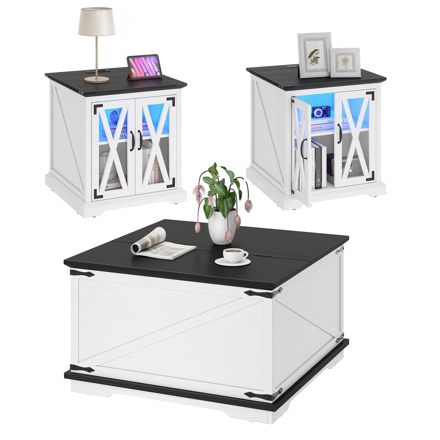 • Modern Coffee Table Set: Elevate your living space with our modern living room table set! This includes 2 sleek side tables, each equipped with a convenient charging station and LED lighting, as well as a stylish coffee table featuring double-layered storage. Say goodbye to clutter and hello to a fully charged, organized lifestyle. Designed to bring function to your home