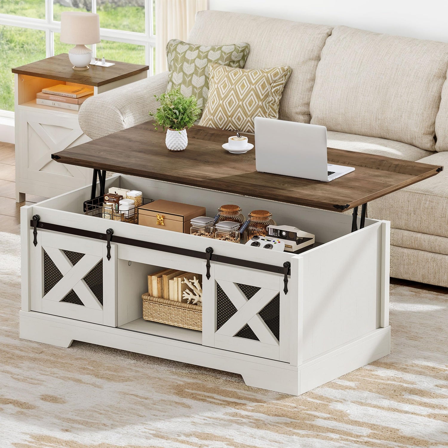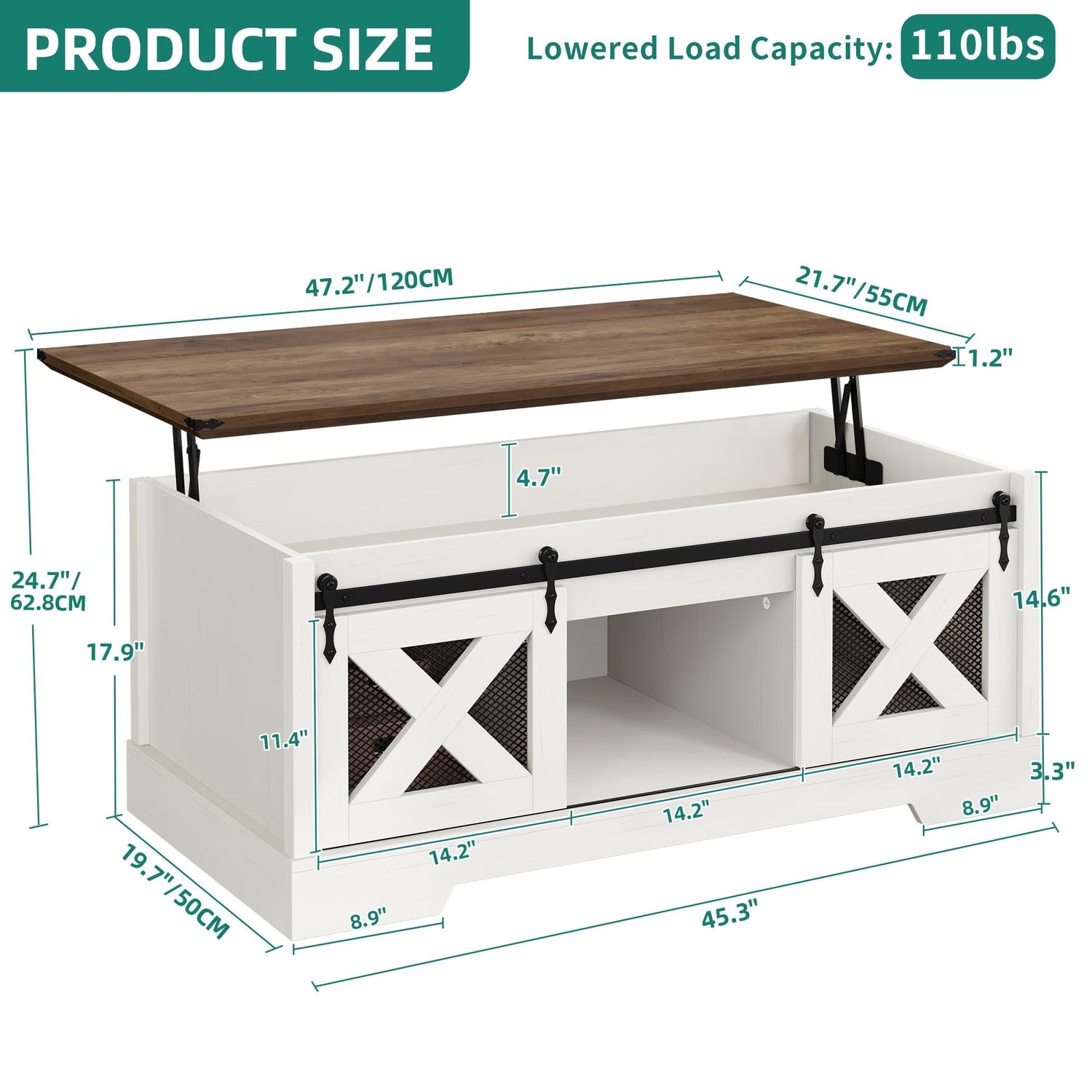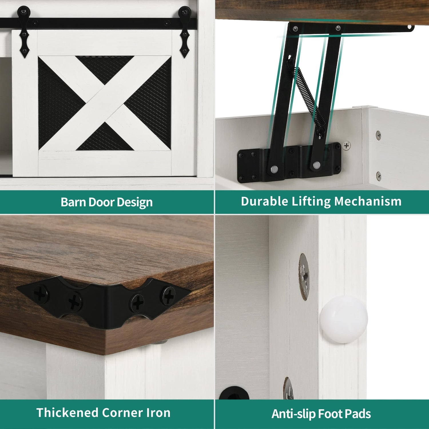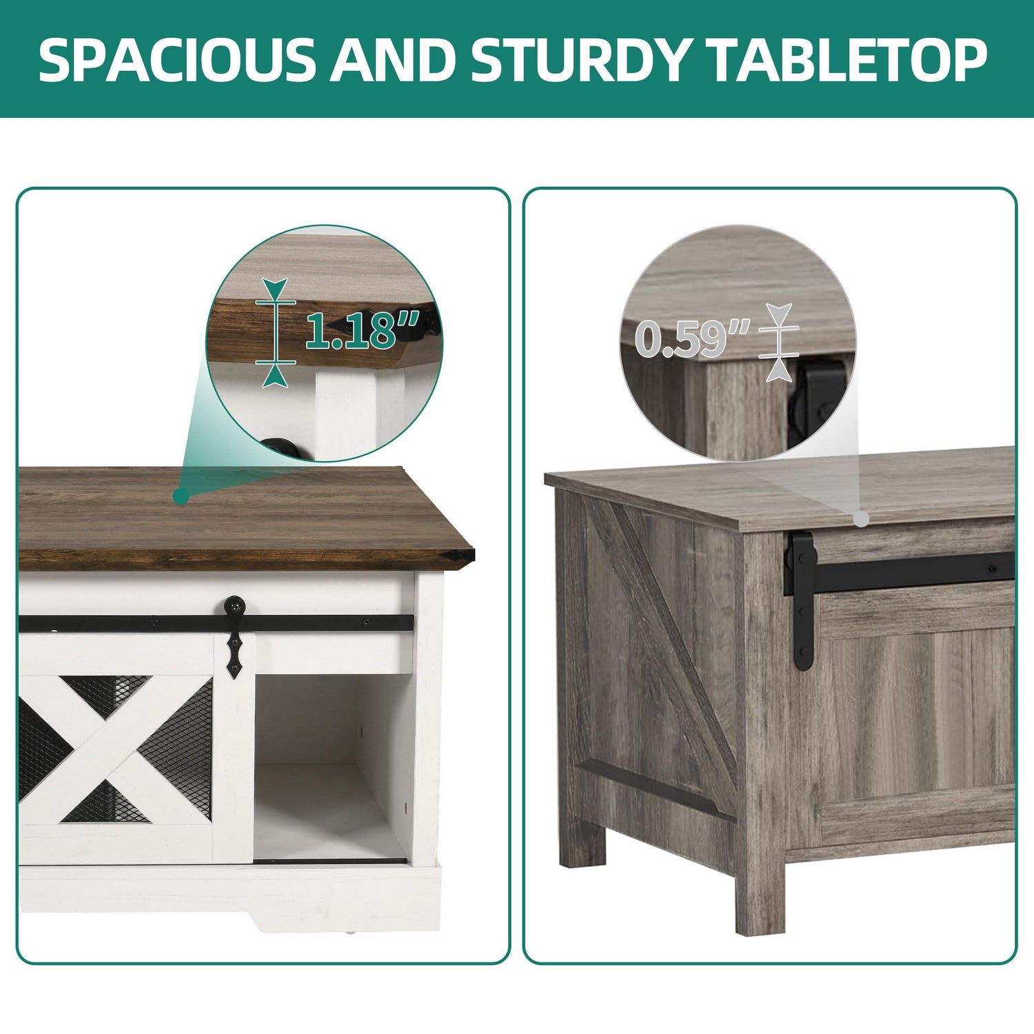 • Sliding Barn Door Design: The sliding design of the farmhouse coffee table allows for easy opening and closing without the need for extra space, offering durability and smooth operation without creating friction or noise.