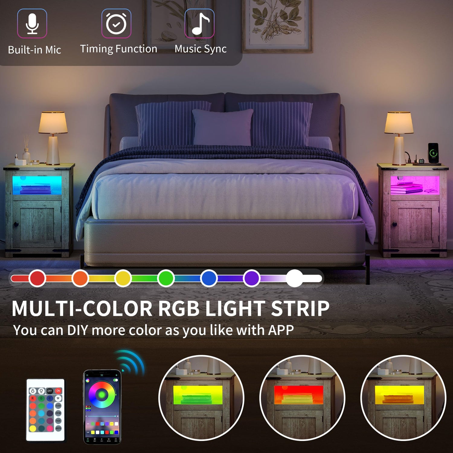 • LED Lights Bedside Table: This end table with storage comes with an LED light pair a cozy and welcoming farmhouse atmosphere. Charming elements include textured finishes and matte metal accents, it adds a unique aesthetic and vintage ambiance to your room