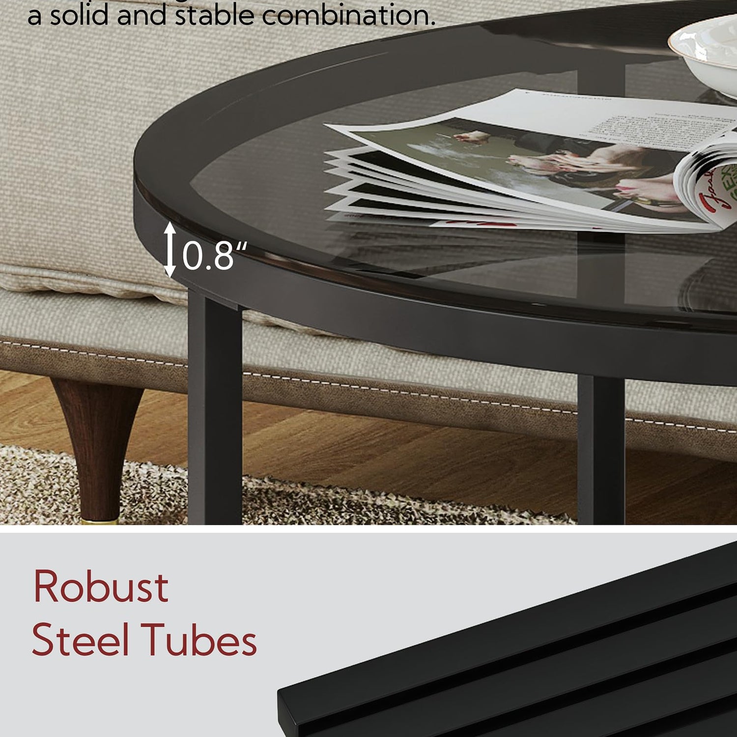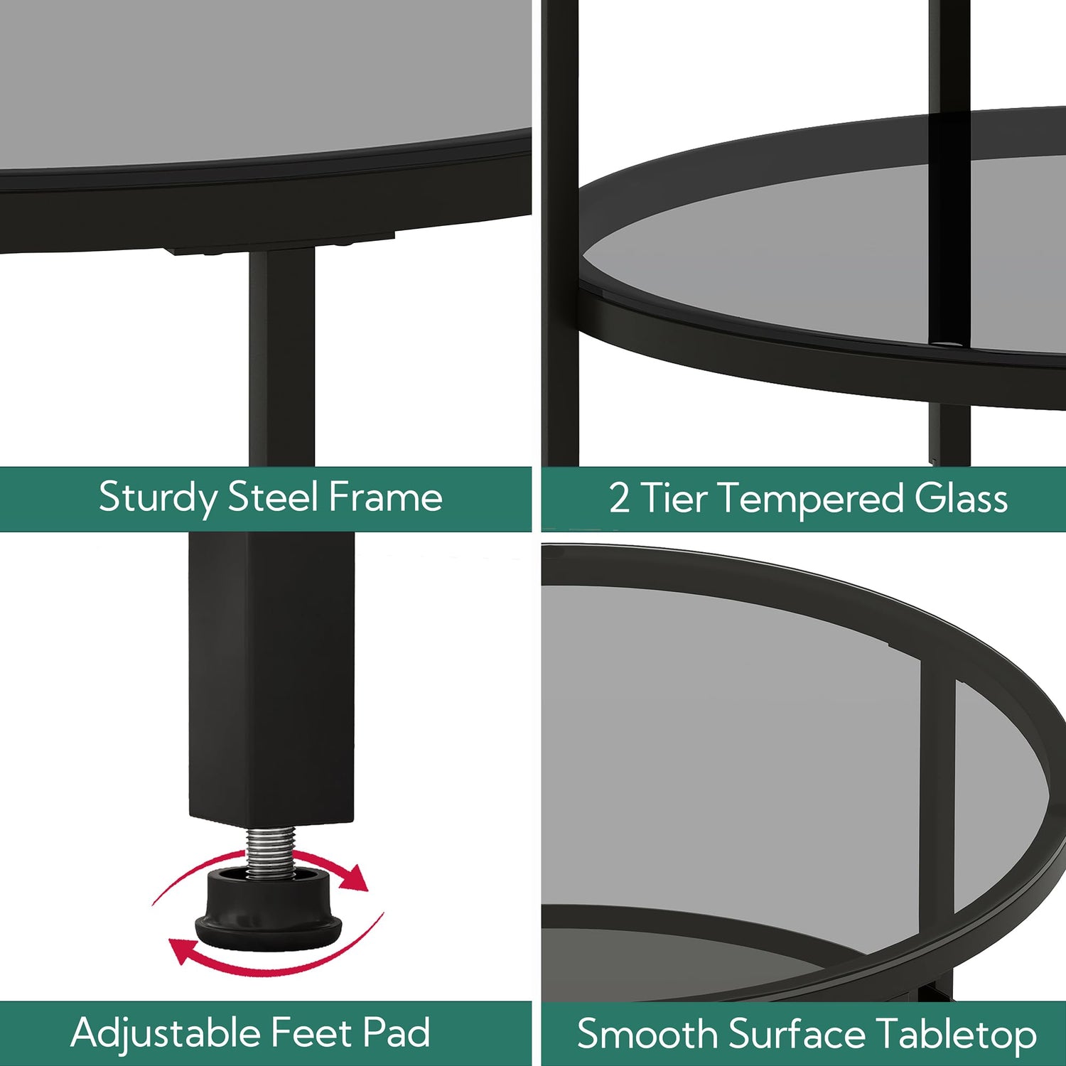 Yusong Round Glass Coffee Tables for Living Room, 2-Tier Circle Coffee Table with Storage, 26" Modern Center Accent Table with Light Black Glass, Small Side Table End Table for Small Space, Bedroom