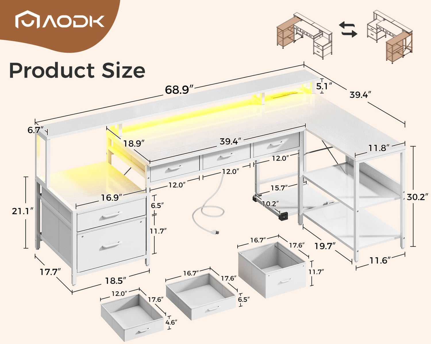 AODK L Shaped Desk with 5 File Drawers, 66" Reversible L Shaped Computer Desk with Power Outlet & LED Strip, Office Desk with Storage Shelves, Gaming Desk with Monitor Shelf, Corner Desk, White