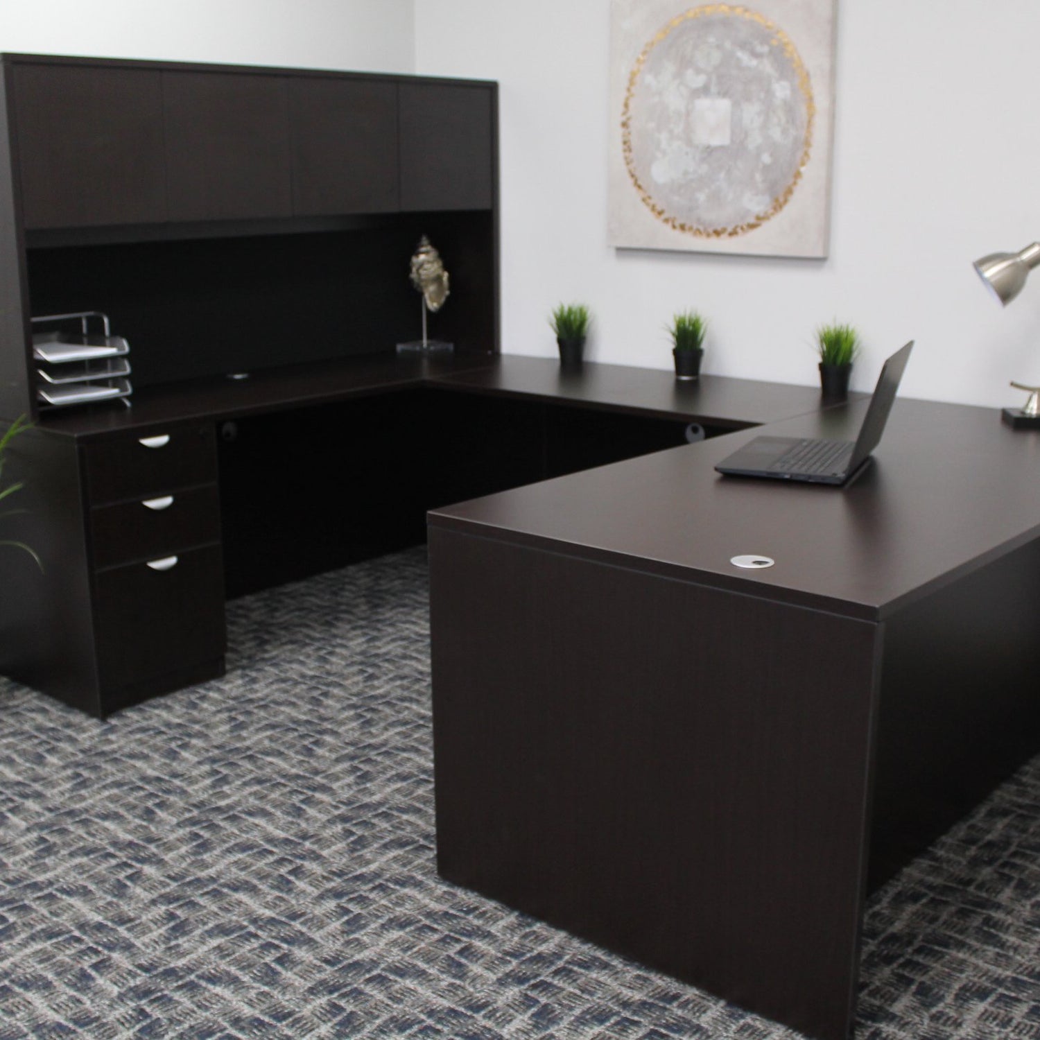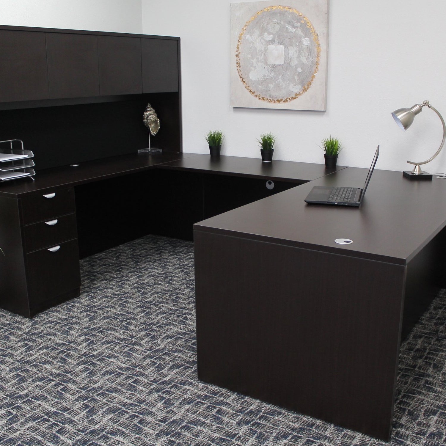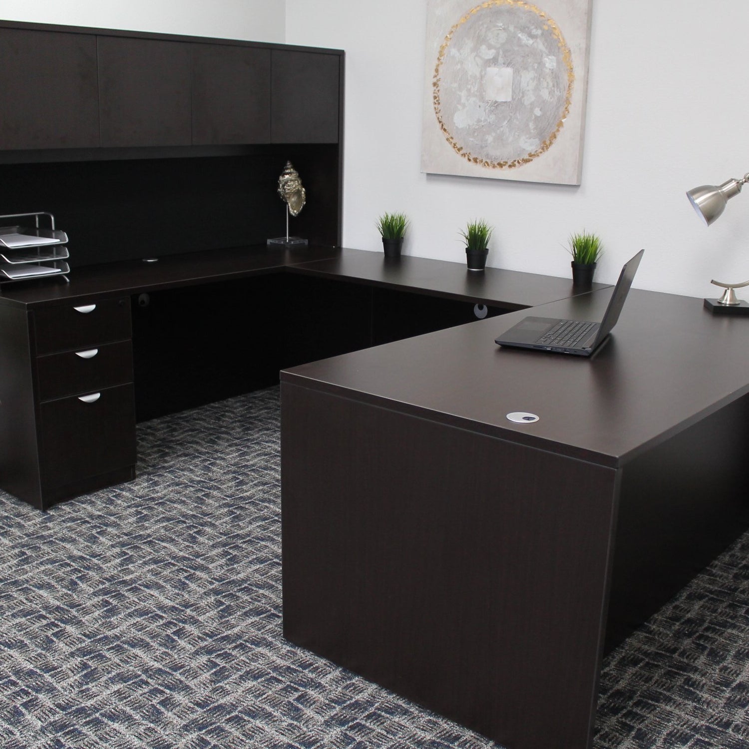 Details: Boss Office Products 71 Inch Executive U-Shape Desk with File Storage Pedestal and Hutch is perfect for your office/home office Space. Finished in beautiful Mocha, this suite features a U-Shaped Desk configuration including (1) 71" x 30" Desk, (1) 48” x 24” bridge, (1) 71" x 24" credenza, (1) 71” x 15” Hutch & (1) 16” x 22” file storage pedestal. It is constructed of thermal fused melamine with 3mm PVC edge banding, which offers excellent durability and is scratch resistant. The desk, bridge and credenza offer ample workspace. They also come with a 1 inch thick top that provides a sturdy surface that will require little maintenance. The Hutch features 4 doors for concealed storage. The pedestal features a file drawer that accommodates letter or legal-size files & 2 accessory drawers for storage of office supplies, paper, books, etc. The top drawer features a locking mechanism for all 3 drawers to keep contents secure. ANSI/BIFMA Compliant - This product has been tested and certified for compliance with rigorous performance requirements and safety standards related to specific furniture products. Assembly is required.