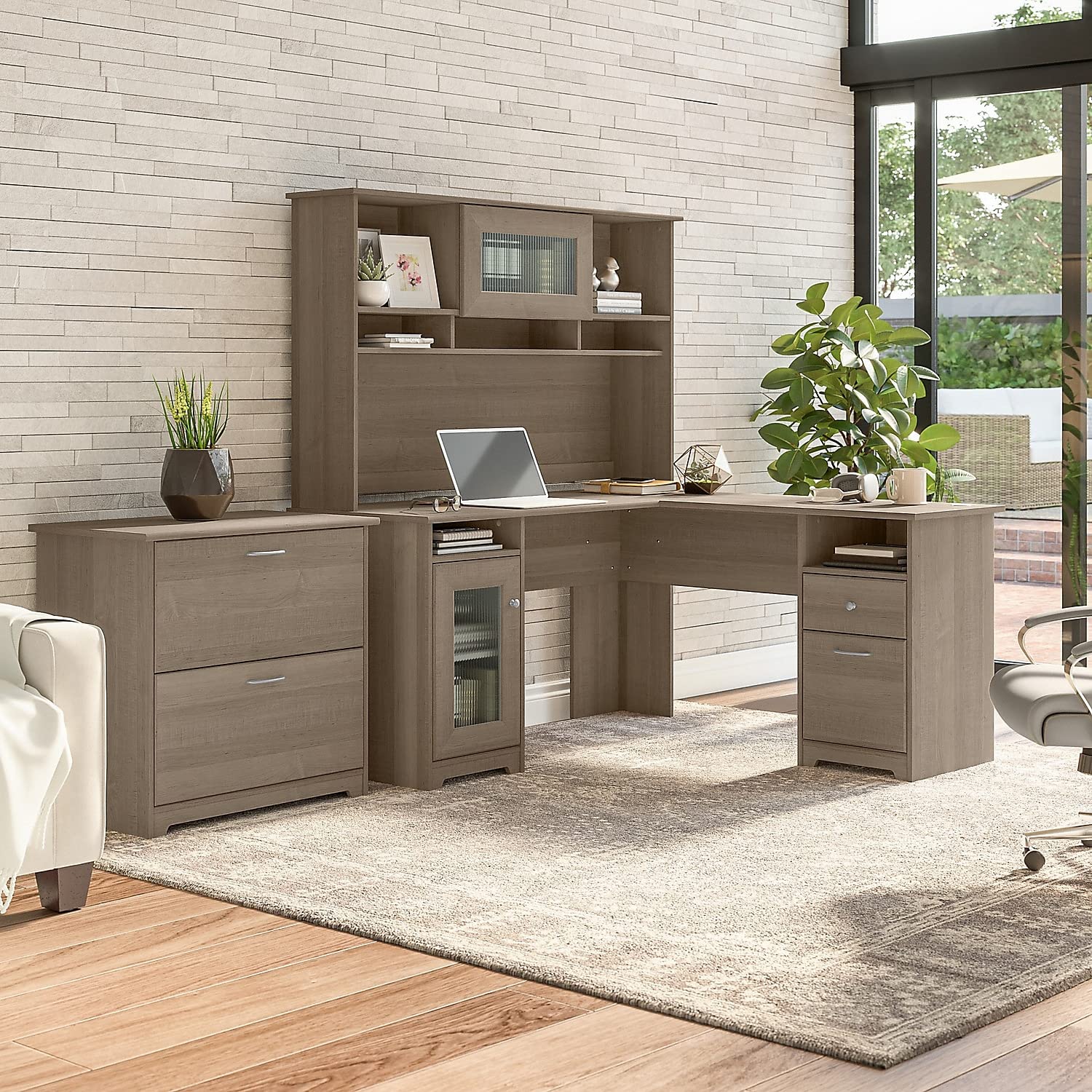 Bush Furniture Cabot 60W L Shaped Computer Desk with Hutch and Lateral File Cabinet in Ash Gray