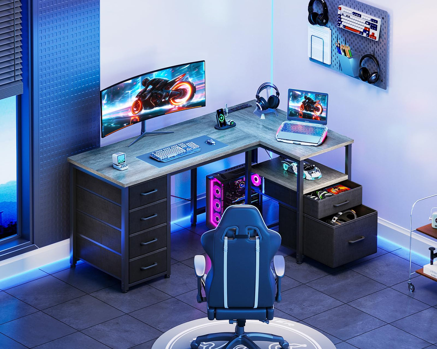 Coleshome L Shaped Computer Desk with 6 Drawers & Power Outlet, 55 Inch Corner Desk with Reversible Storage Shelf & File Drawer, Home Office Desk, Grey Oak
