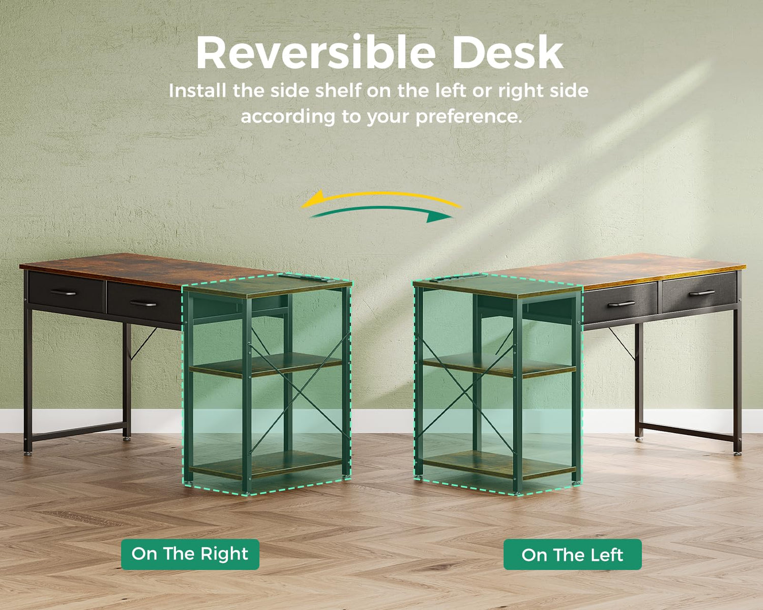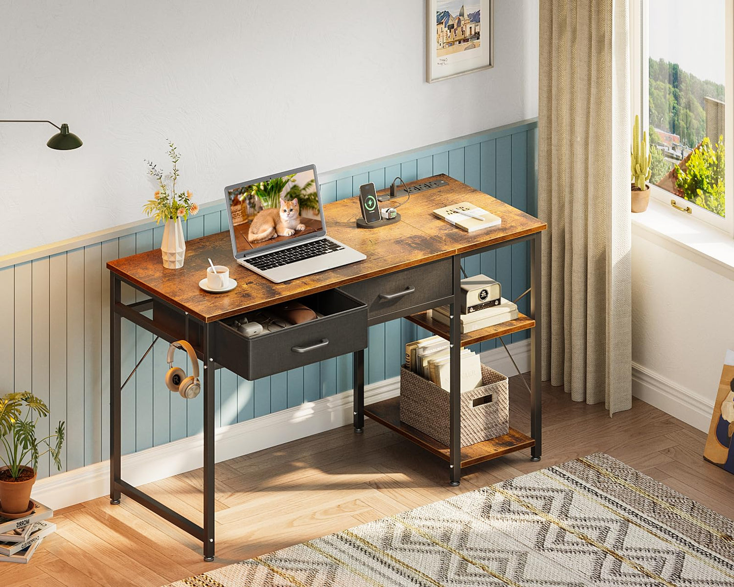 Coleshome Laptop Desk, 40 Inch Small Desk with Drawers & Power Outlet for Bedroom, Computer Desk Home Office Desk with Storage Shelves, Reversible Study Table for Small Spaces, Rustic Brown