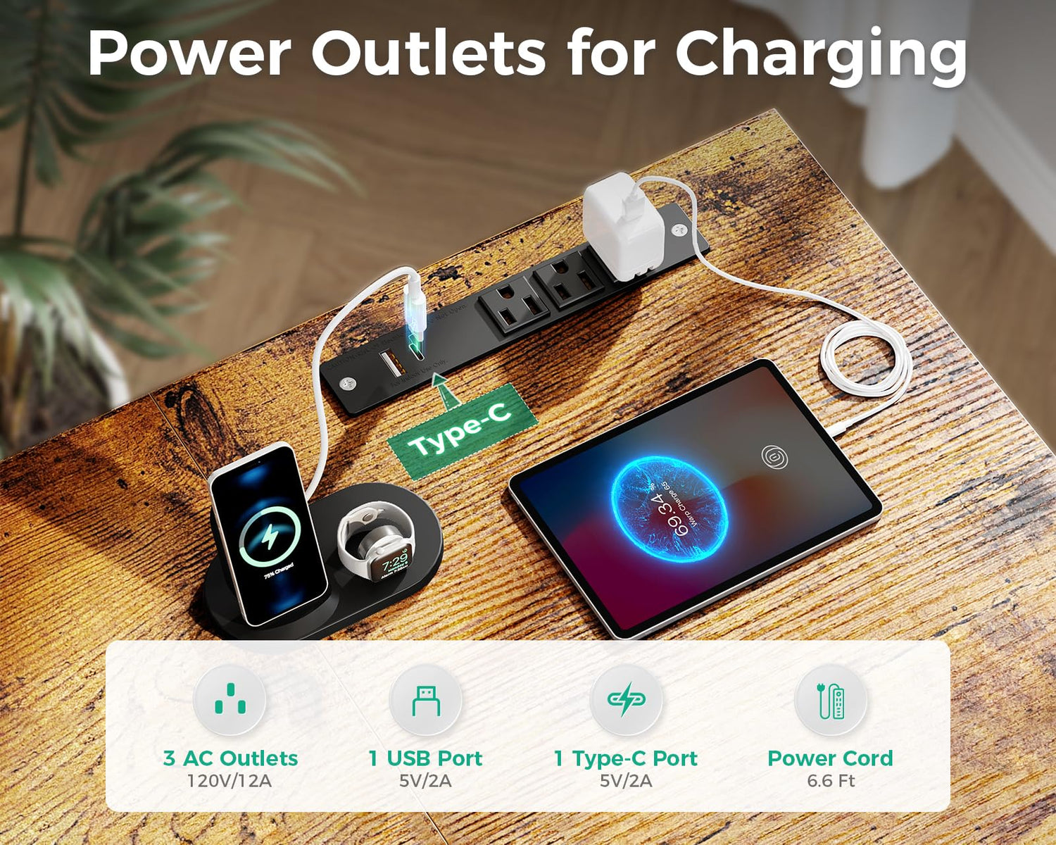 - 【Built-in Power Outlet】This small office desk owns a built-in power strip with 3 AC Outlets & 1 USB Port & 1 Type-C Port which can provide power support for all your electronic equipments such as laptop, ipad and phone.
