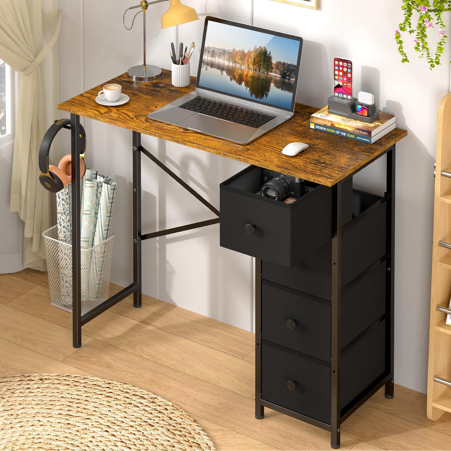 DAOUTIME Computer Desk with 4 Fabric Drawers, 35.4 Inch Small Home Office Writing Desk, Simple Table PC Desk for Small Places, Kids Girls Teen Study Writing Desk for Bedroom Dorm Rustic Brown