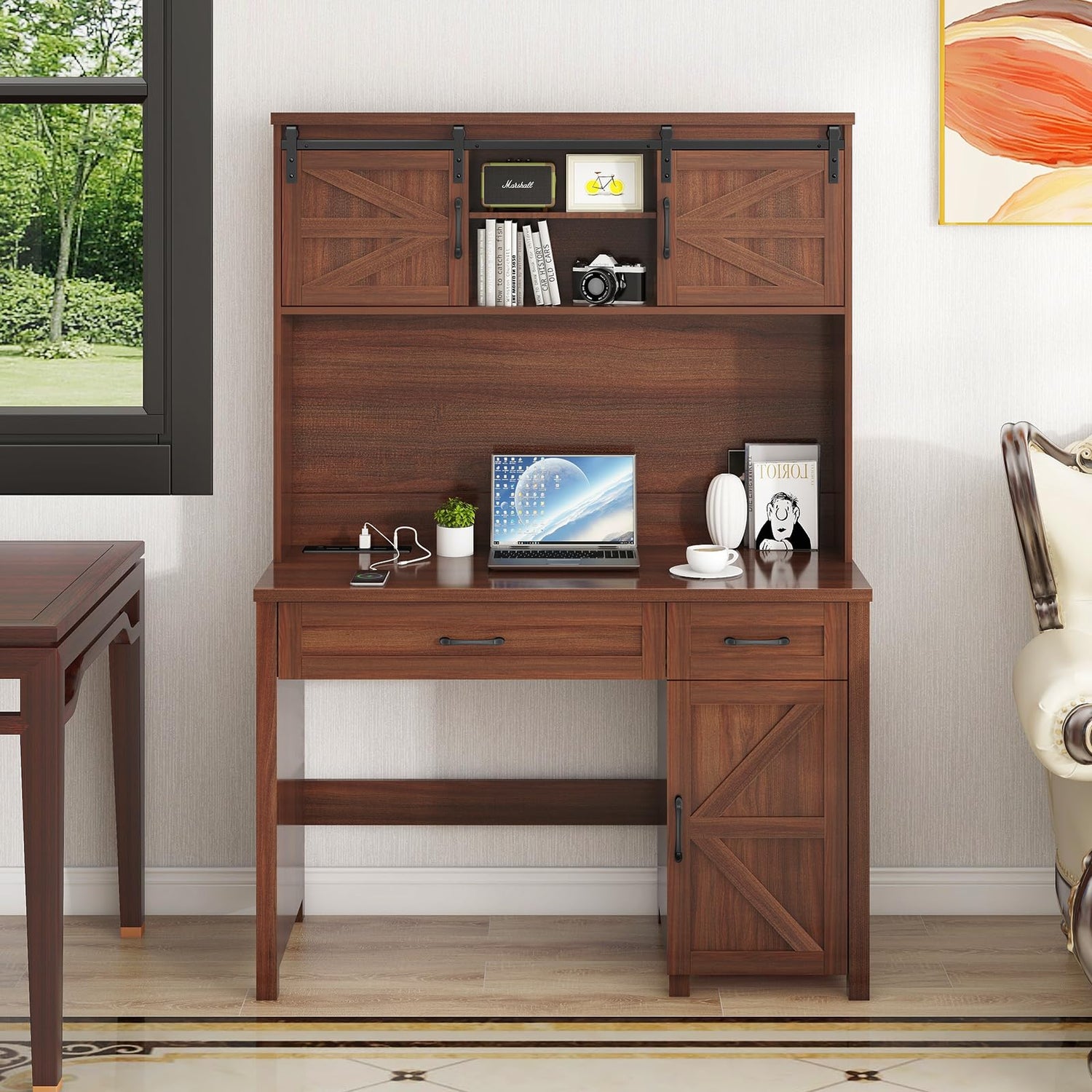 Farmhouse 47" Executive Desk, Computer Desk with 2 Drawers and Storage Cabinet, Home Office Desk with Hutch, Charging Hub, Workspace for Work and Study, Brown