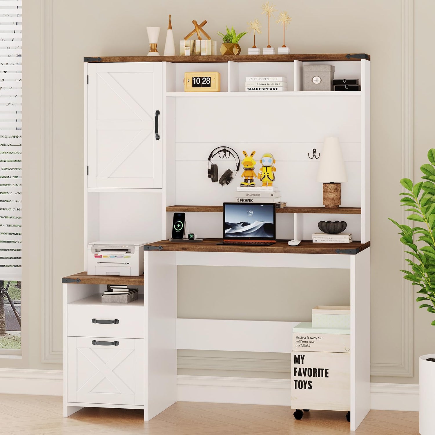 Farmhouse Executive Desk 51" Computer Desk with 2 Drawers Storage Cabinet and RGB LED Lights Power Outlets, Wood Home Office Desk with Hutch and Monitor Stand for Work Study Writing