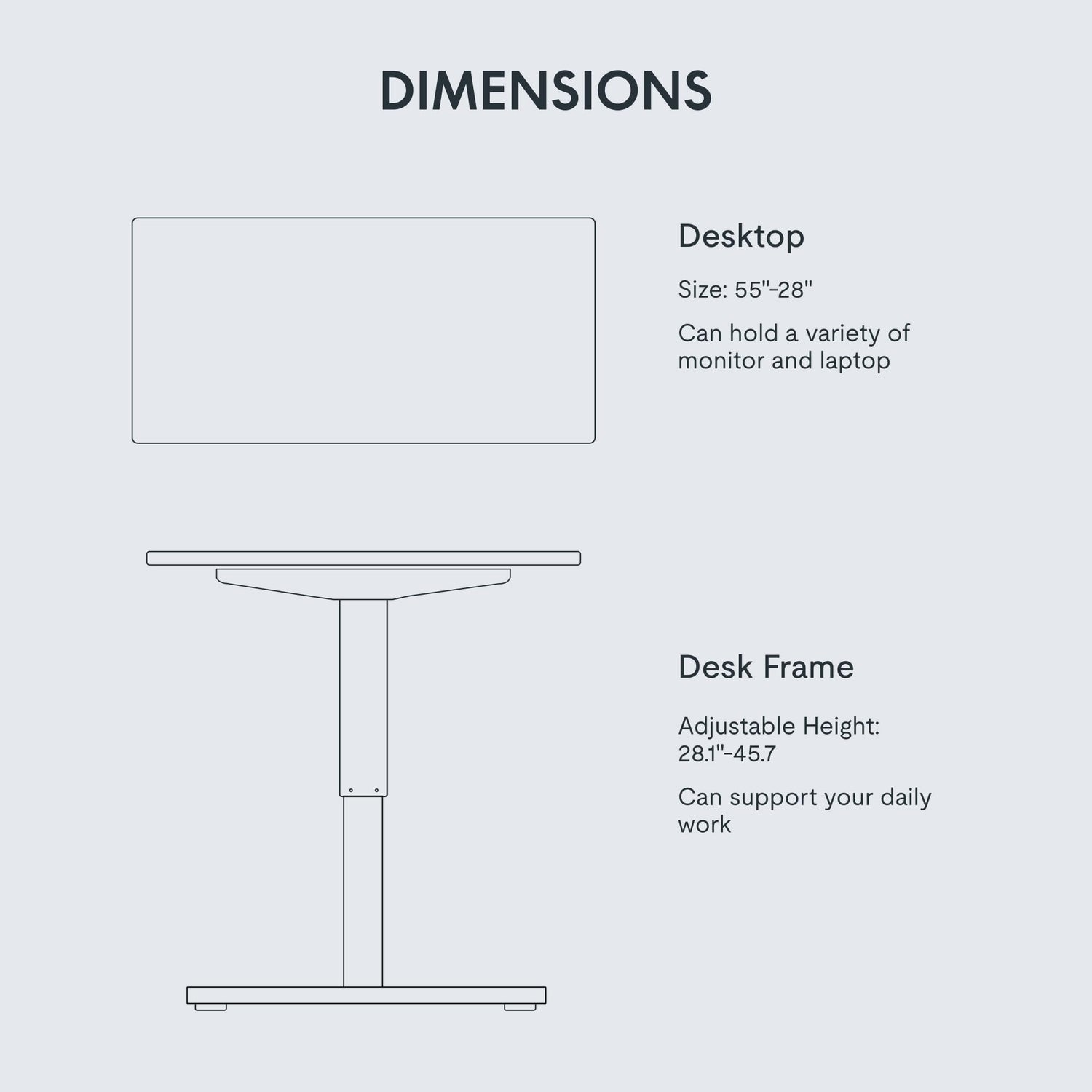 • SMOOTH ELECTRIC HEIGHT ADJUSTMENT: Say goodbye to manual height adjustments. This desk is equipped with an electric lift system that allows you to easily adjust the desk's height from 28.1" to 45.7"(without 1" thickness of table top included). Even better, the motor operates quietly with noise levels below 50 dB, ensuring a peaceful working environment.