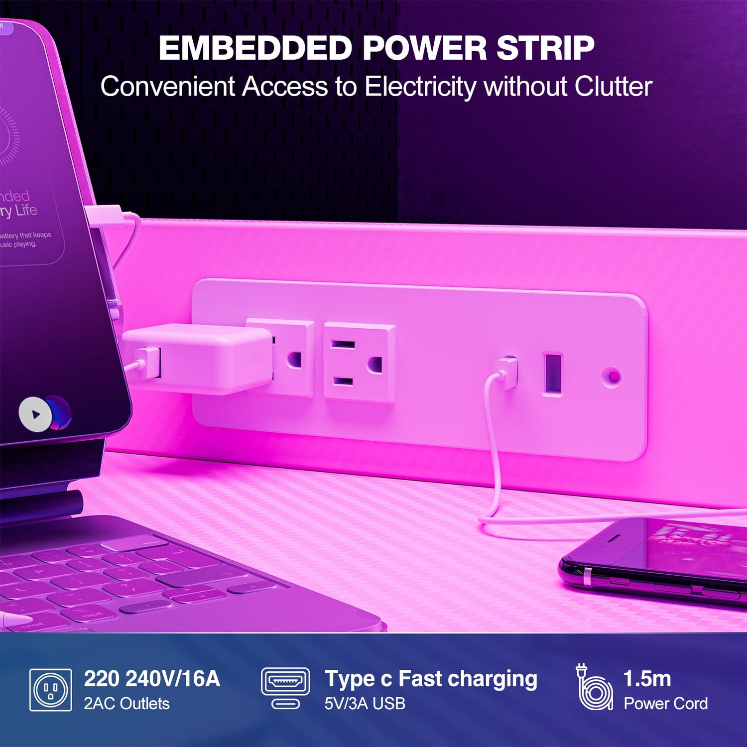 • Power outlet with two sockets, USB, and Type-C fast charging for easy device charging.