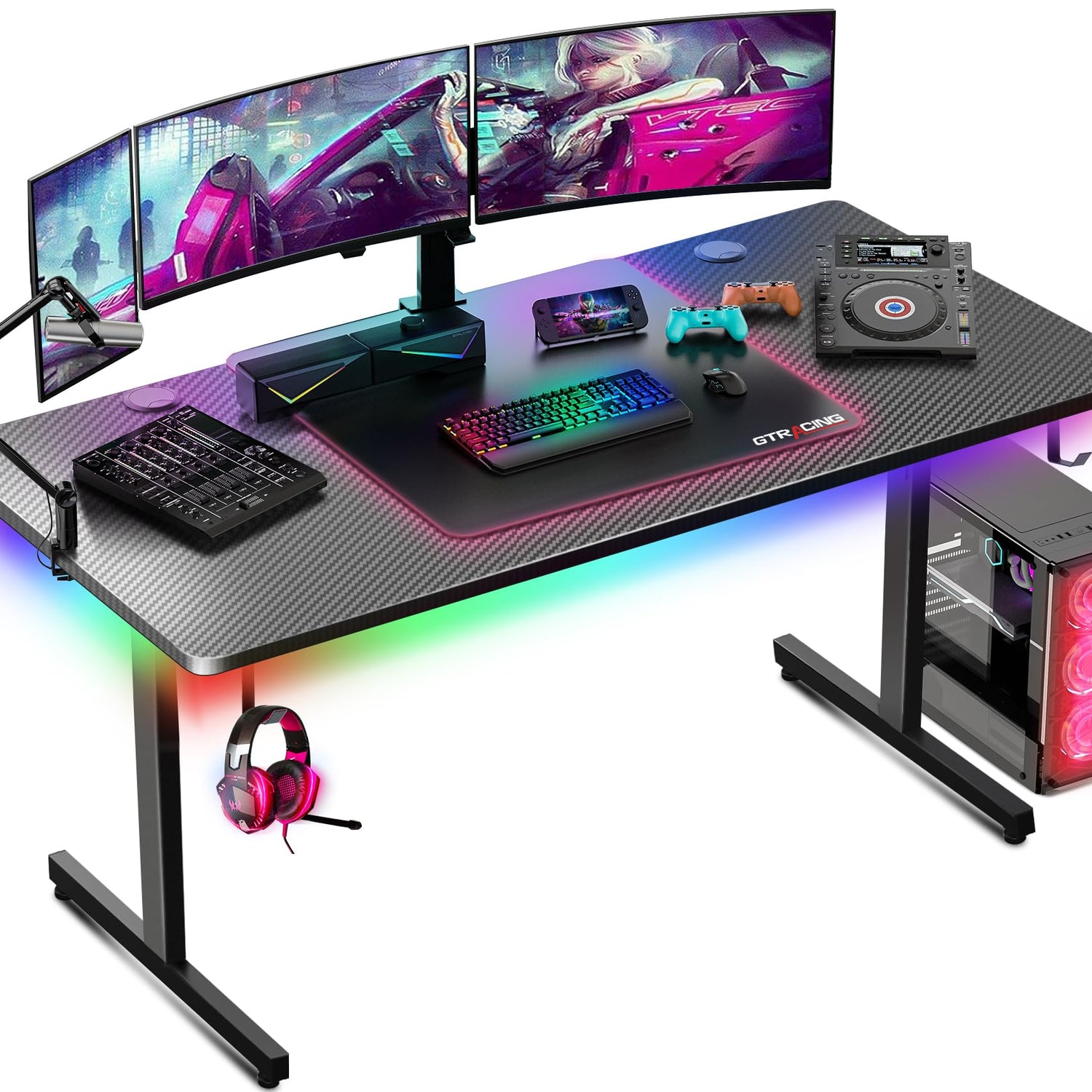 GTRACING Gaming Desk 55 Inch with LED Lights, Large Computer Desk with Mouse Pad for Home Office, T-Shaped Carbon Fibre Surface PC Game Workstations with Headphone Hook, Black