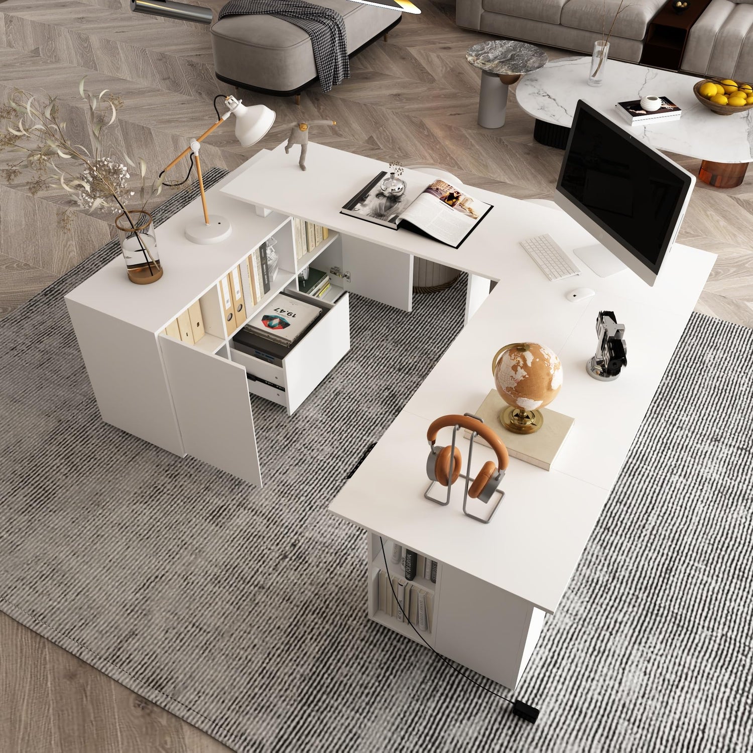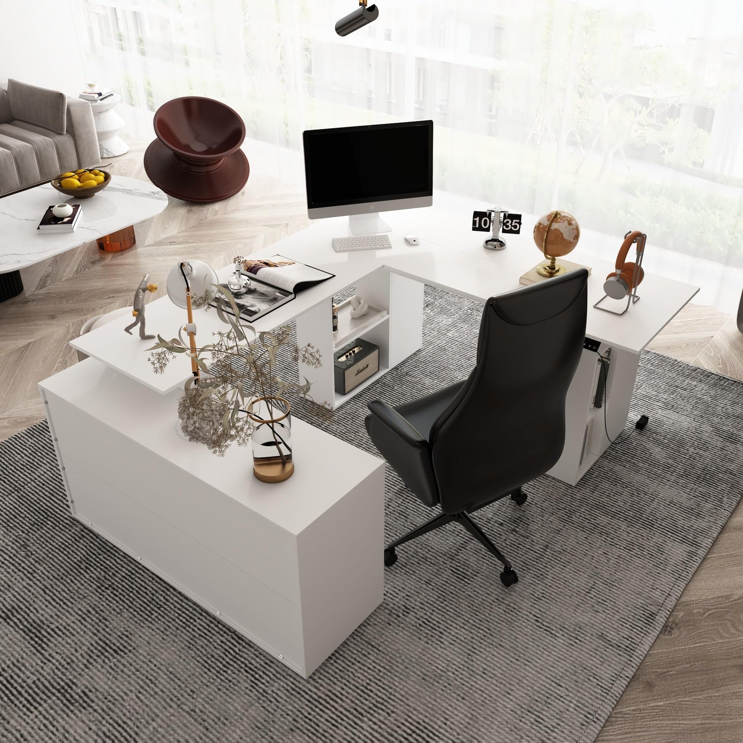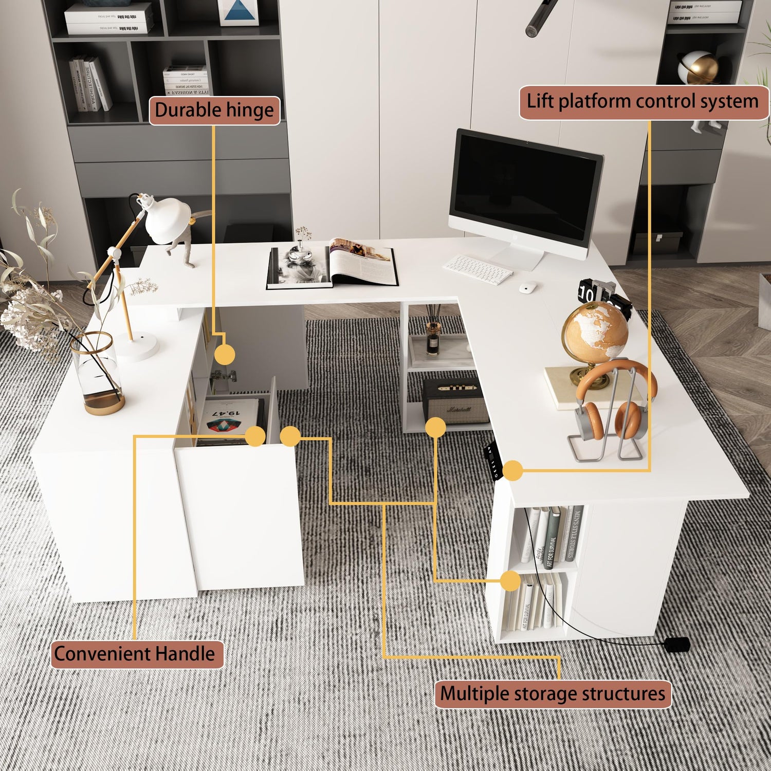 Homsee Electric Height Adjustable Standing Desk with Storage Cabinet, U-Shaped Computer Desk with Drawer & Open Shelves for Home Office, Workstation Desk for Writing Study Work Executive, White