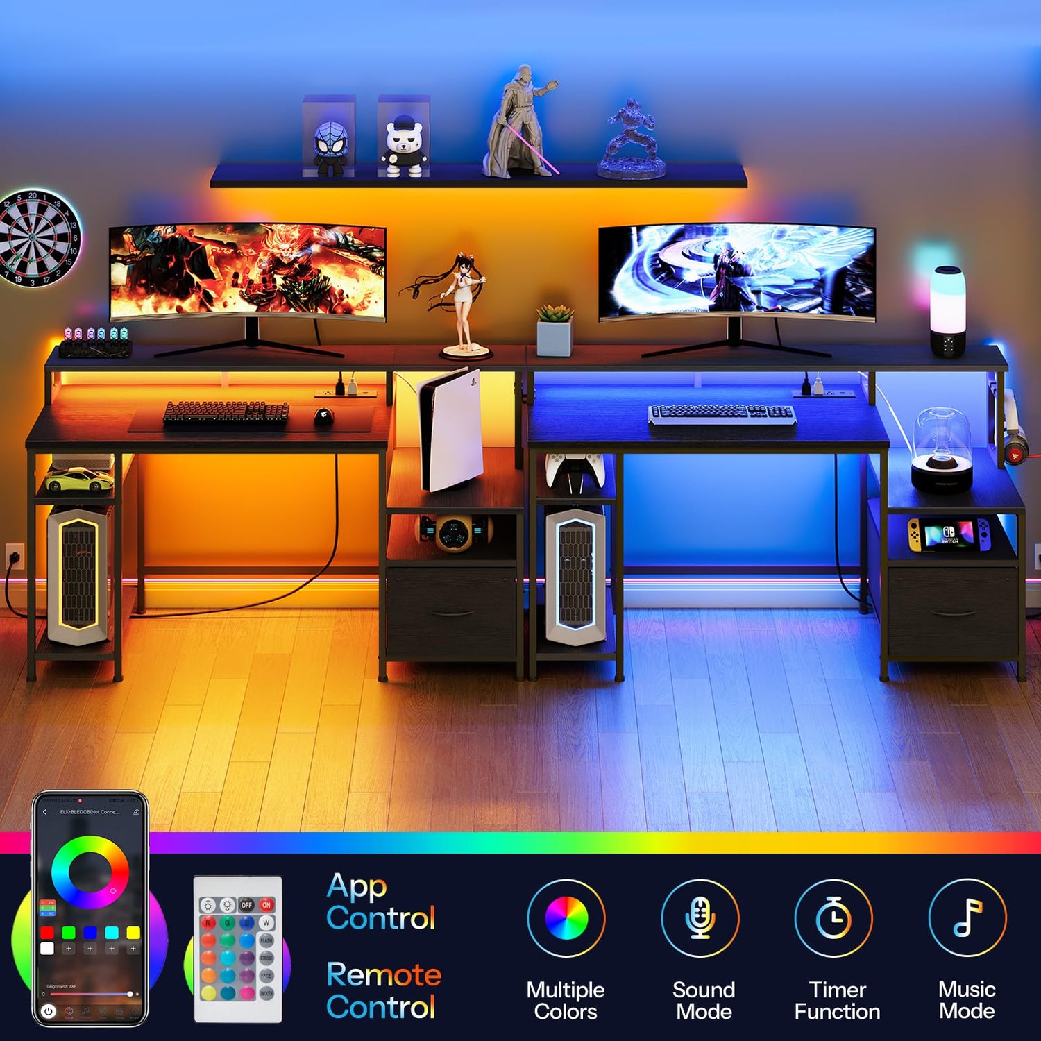 - Desk With LED Lights: This gaming desk features an LED strip controlled via an app or remote, this App can change the light of the LED strip according to the rhythm of the music. You can choose any mode and color to decorate your room, creating a cooler gaming atmosphere
