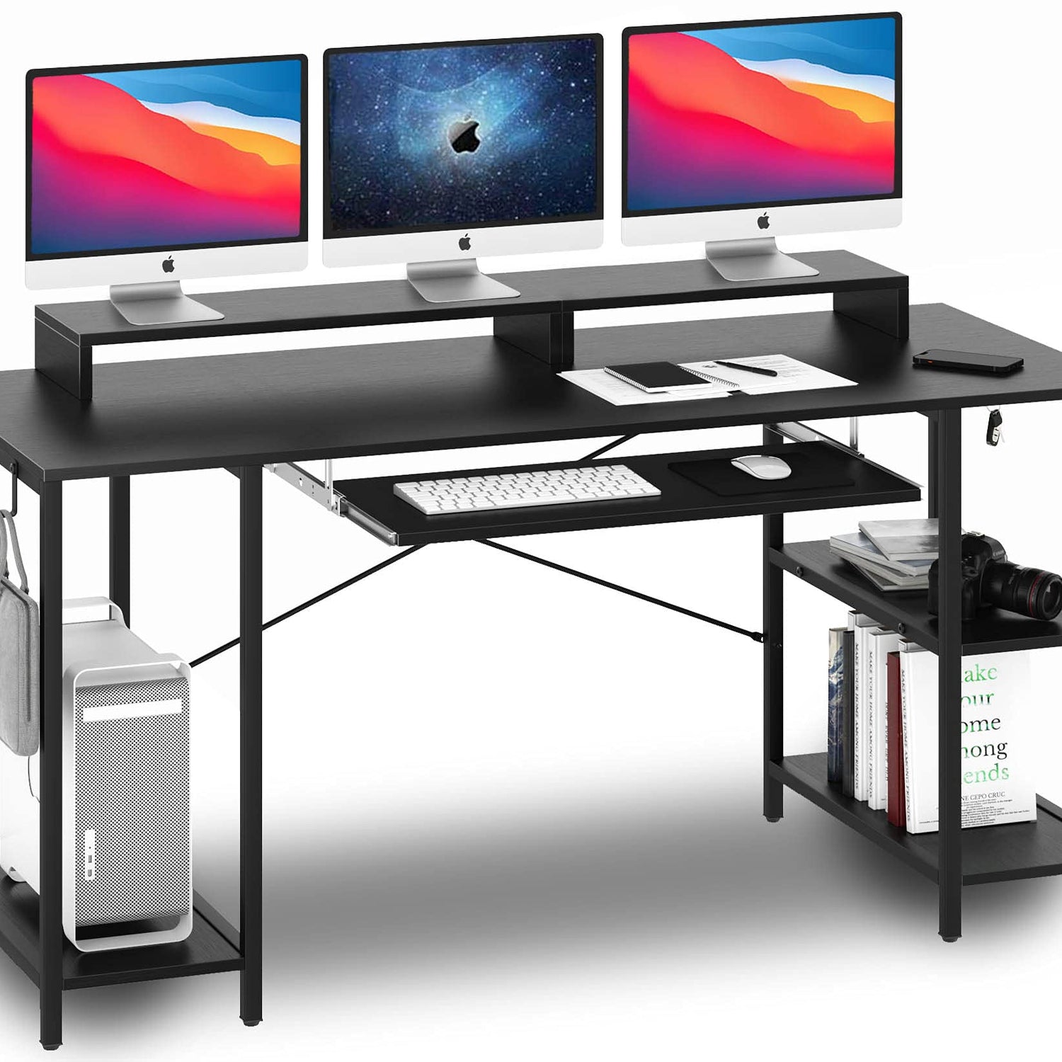 • 【Computer Desk with Monitor Shelf】 Large office desk with top shelf raises your monitor to a ergonomic viewing height, reduce neck and eye strain. Wood desk with 2 removable monitor stands is an great idea for two monitors, printer space, laptop, notebook, TV or even as a desk shelf.