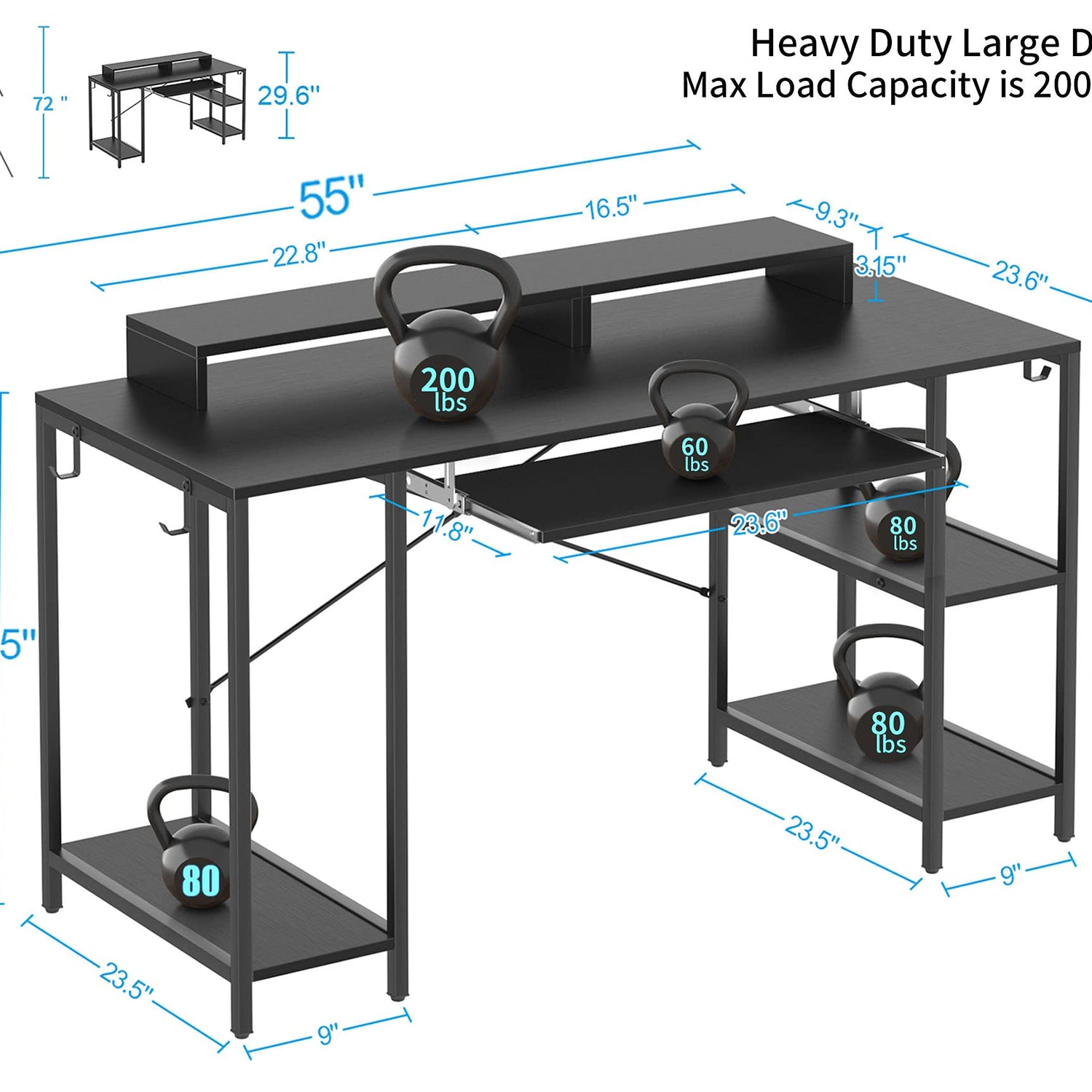 HYPIGO Workstation Desk with Keyboard Tray, 55 Inch Computer Desk with Storage Shelves Monitor Stands and 4 Iron Hooks, Industrial Desk for Home Office