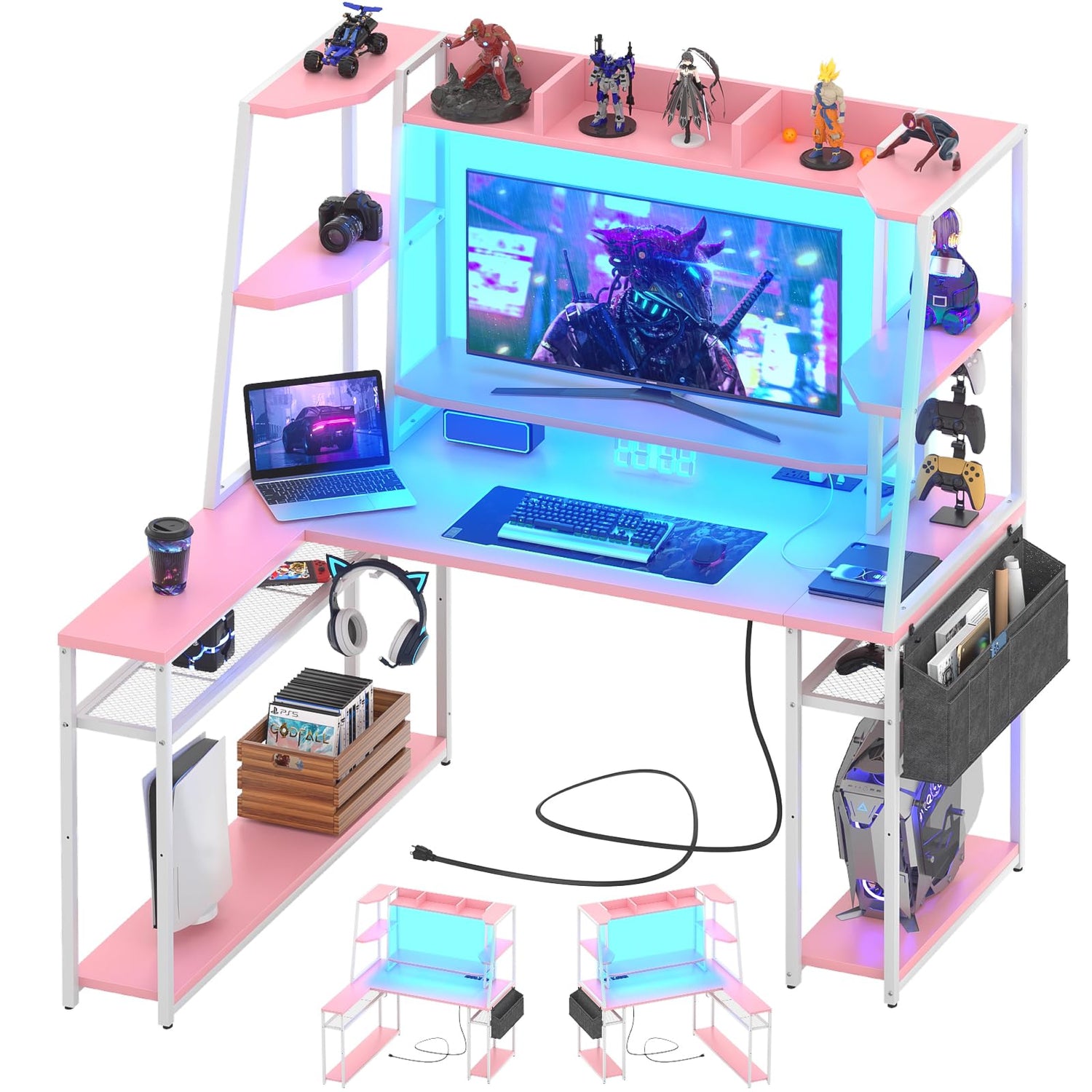 L Shaped Gaming Desk - Pink Gaming Desk with Hutch & Shelves, 47'' Gaming Computer Desk with LED Lights & Charging, Reversible PC Gaming Desk L Shape with Storage, L Desk for Gaming with Monitor Stand