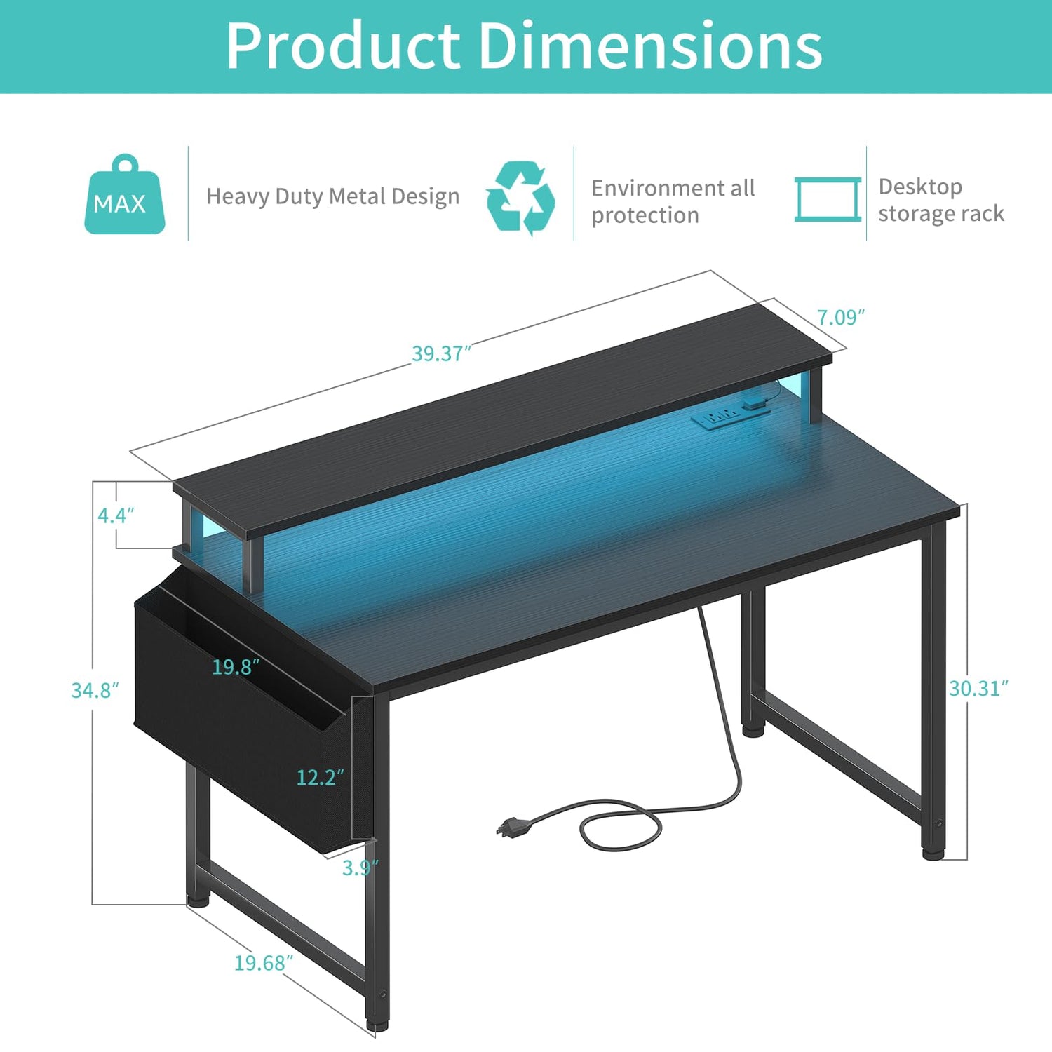 Lufeiya Black Gaming Desk with LED Lights and Power Outlets, 40 Inch Teen Writing Study Table Home Office Desks with Monitor Stand, Computer Desk with Charging Station USB Port, Black