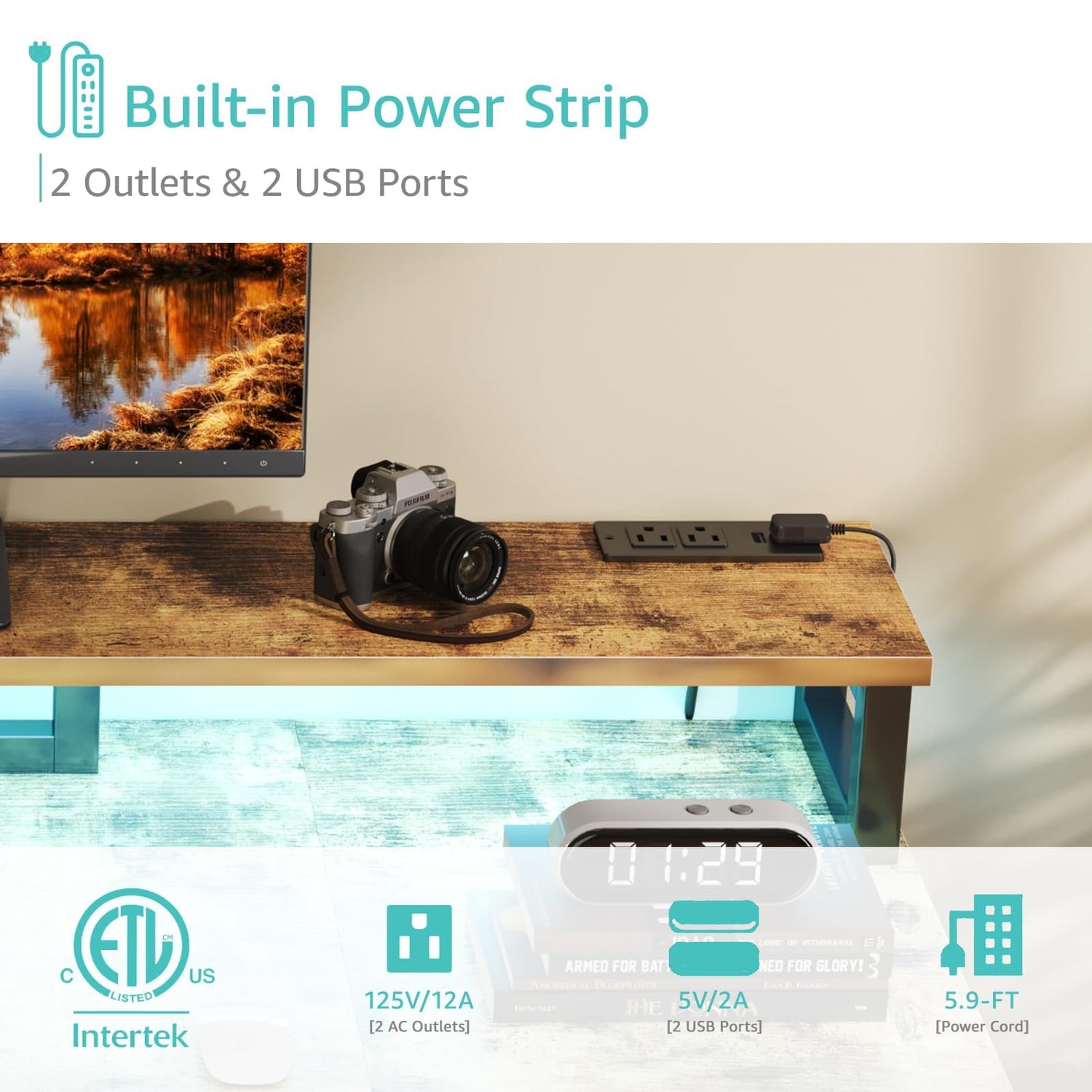 - Safety Multi-functional Power Strip: The computer desk includes a built-in power strip with 2 power outlets & 2 USB charging ports for your computer, monitor, gaming gear, pad, phone and other electronic devices.