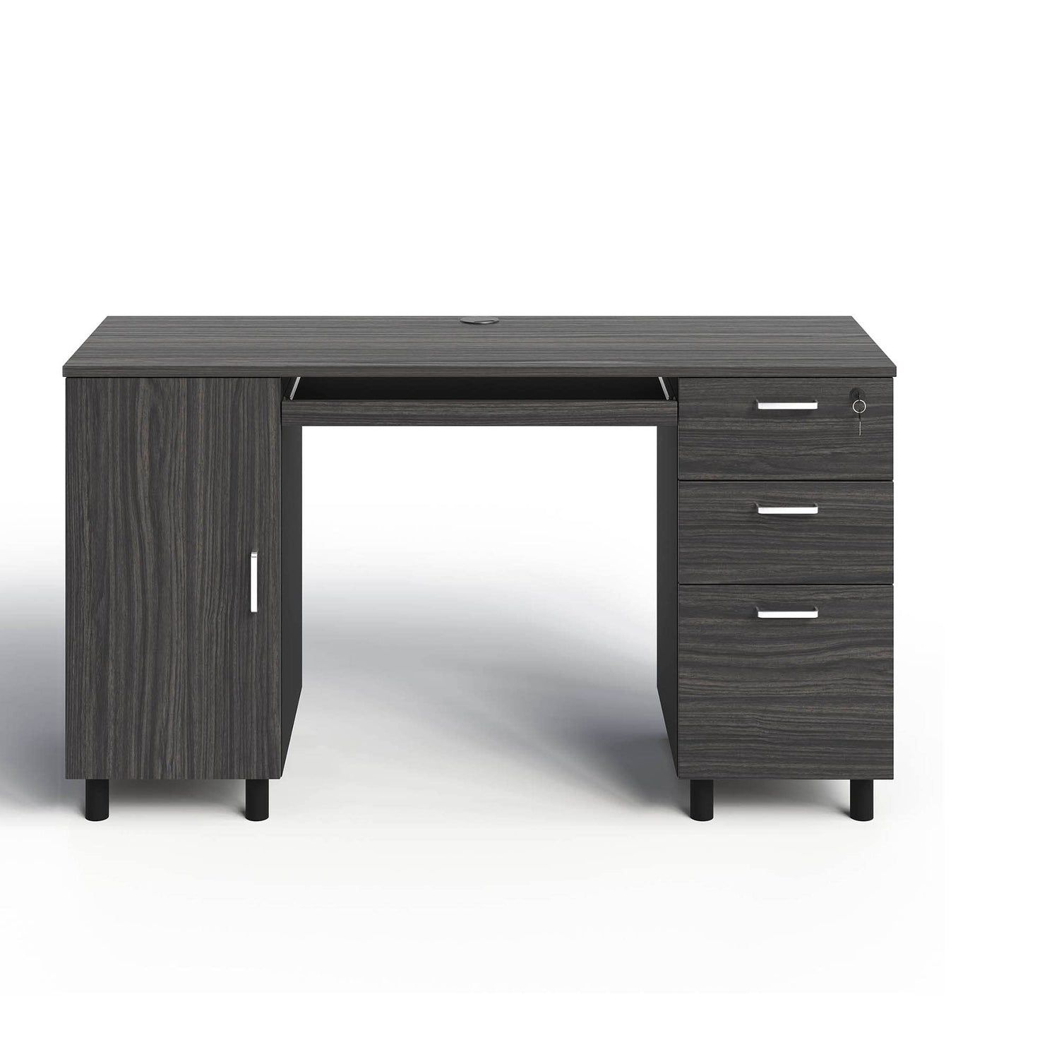 - This desk features a large storage cabinet, a pullout keyboard tray, and 3 lockable drawers that can be locked with one key.