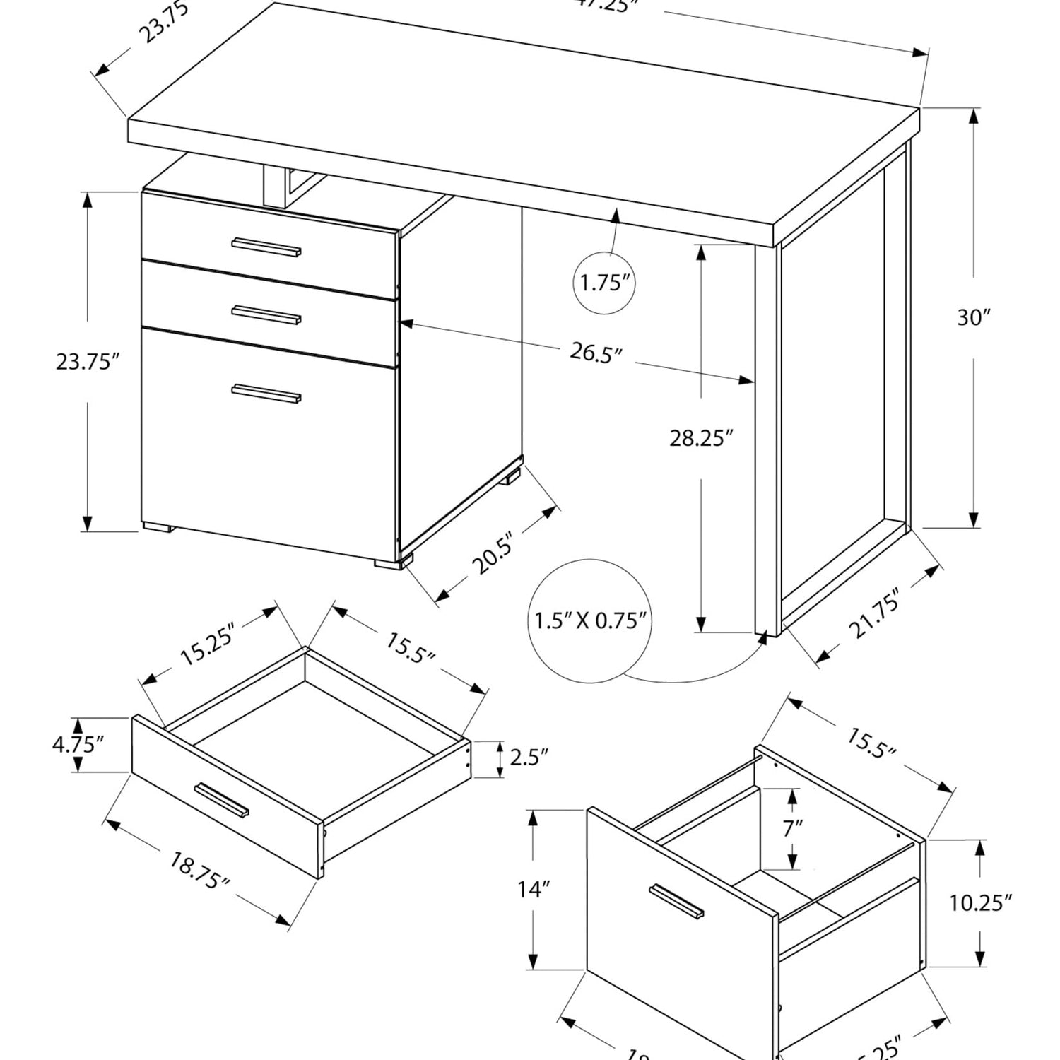 Details: The trendy and industrial look of this computer desk in a chic brown wood grain finish is the perfect combination of function, durability and design in a modern form. With clean lines, a floating top, and black metal legs this desk will add pizzazz to your home office. Featuring two storage drawers and a file drawer on metal glides that can conveniently be assembled on the Left or right side, making this unit uniquely yours to design. The large Thick paneled surface provides plenty of room to meet your working needs without compromising style.