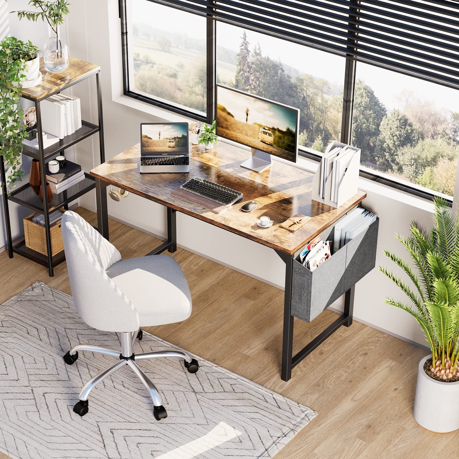 OLIXIS Computer Desk Home Office 48 Inch Writing Study Work Desk witne Storage Bag, Headphone Hooks, Large Simple Modern Wood Kids Student PC Table - Brown