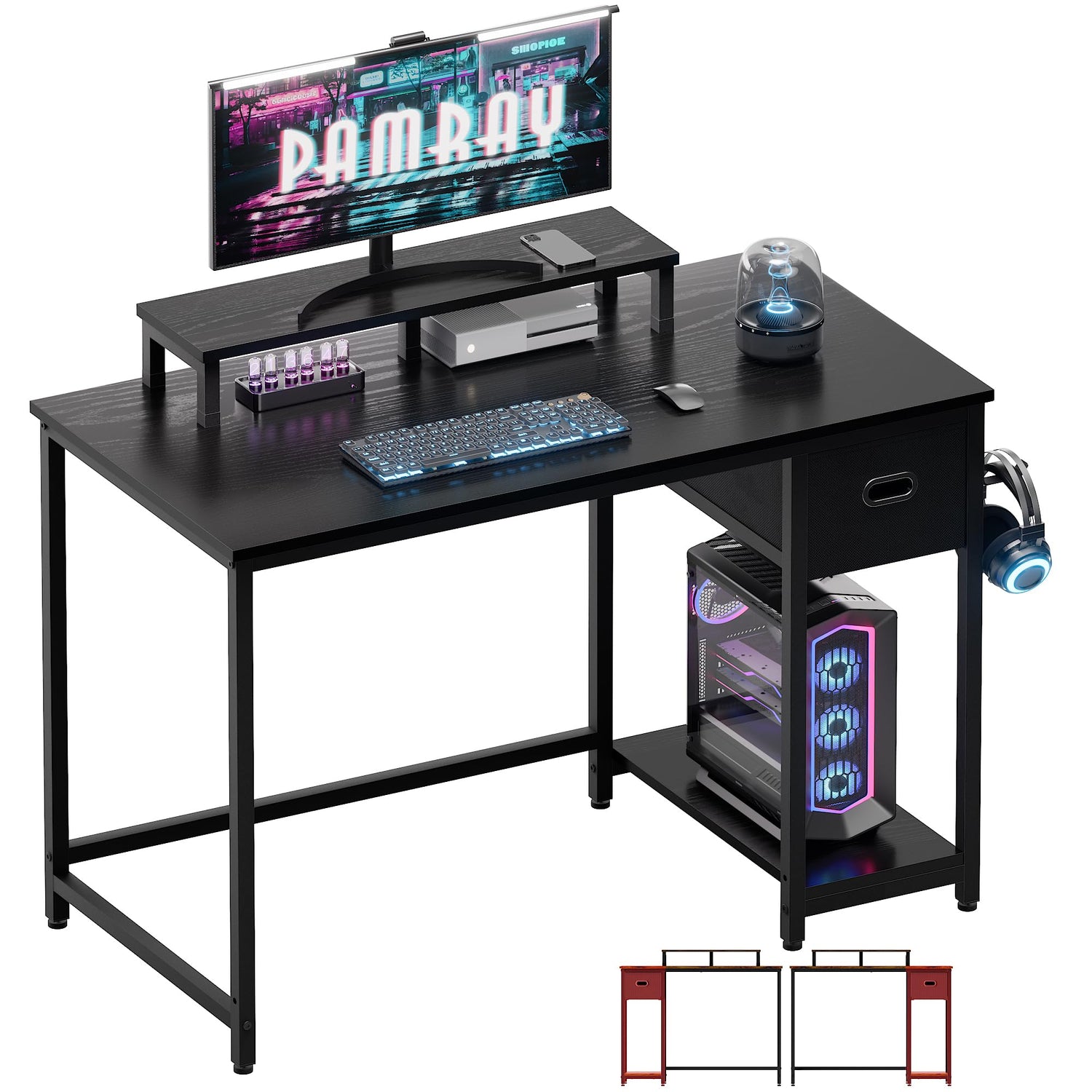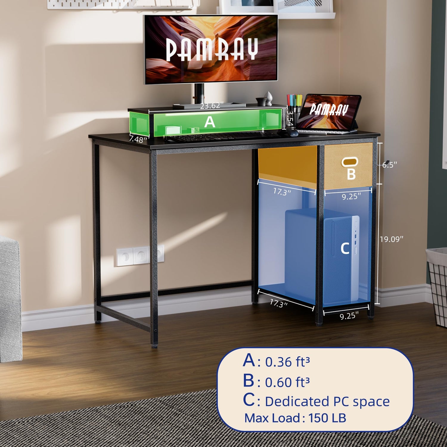 - Ample storage space -- Storage capacity: 1 non-woven drawer (0.59 cubic feet), 1 computer case stand (1.83 cubic feet), 2 hanging hooks (for storing your backpack and headphones).