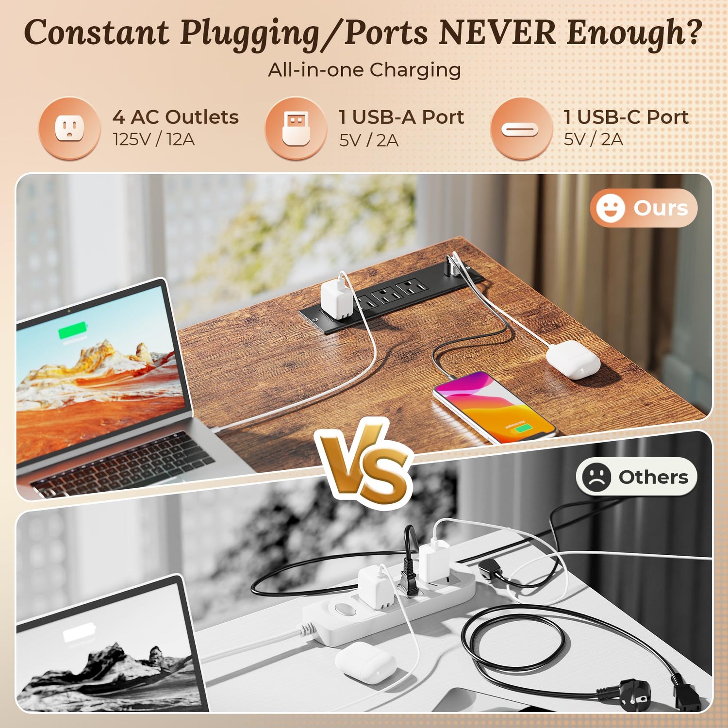 - 【Home Office Desk with Charging Station】No more crawling under the desk for plugs. This PC desk for home office includes 4 AC outlets, 1 USB-A port, and 1 USB-C port, perfect for powering everything from your laptop and monitor to your phone, tablet, or desk lamp. Charge everything without leaving your seat with this study desk