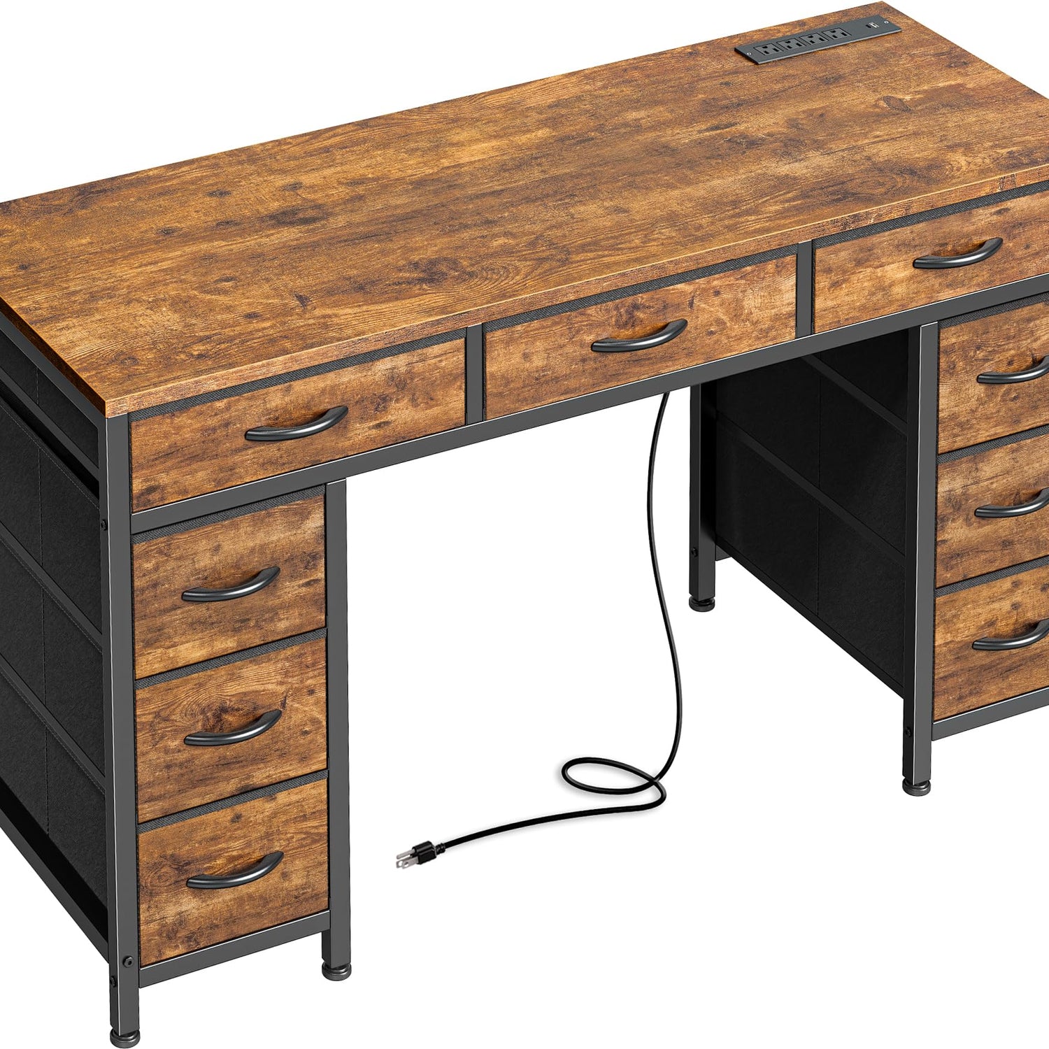 PRAISUN 47 Inch Office Desk with Outlets, Computer Desk with 9 Fabric Drawers, Writing Gaming Work Study Desk for Bedroom, Living Room, Home Office, Large Storage, Rustic Brown
