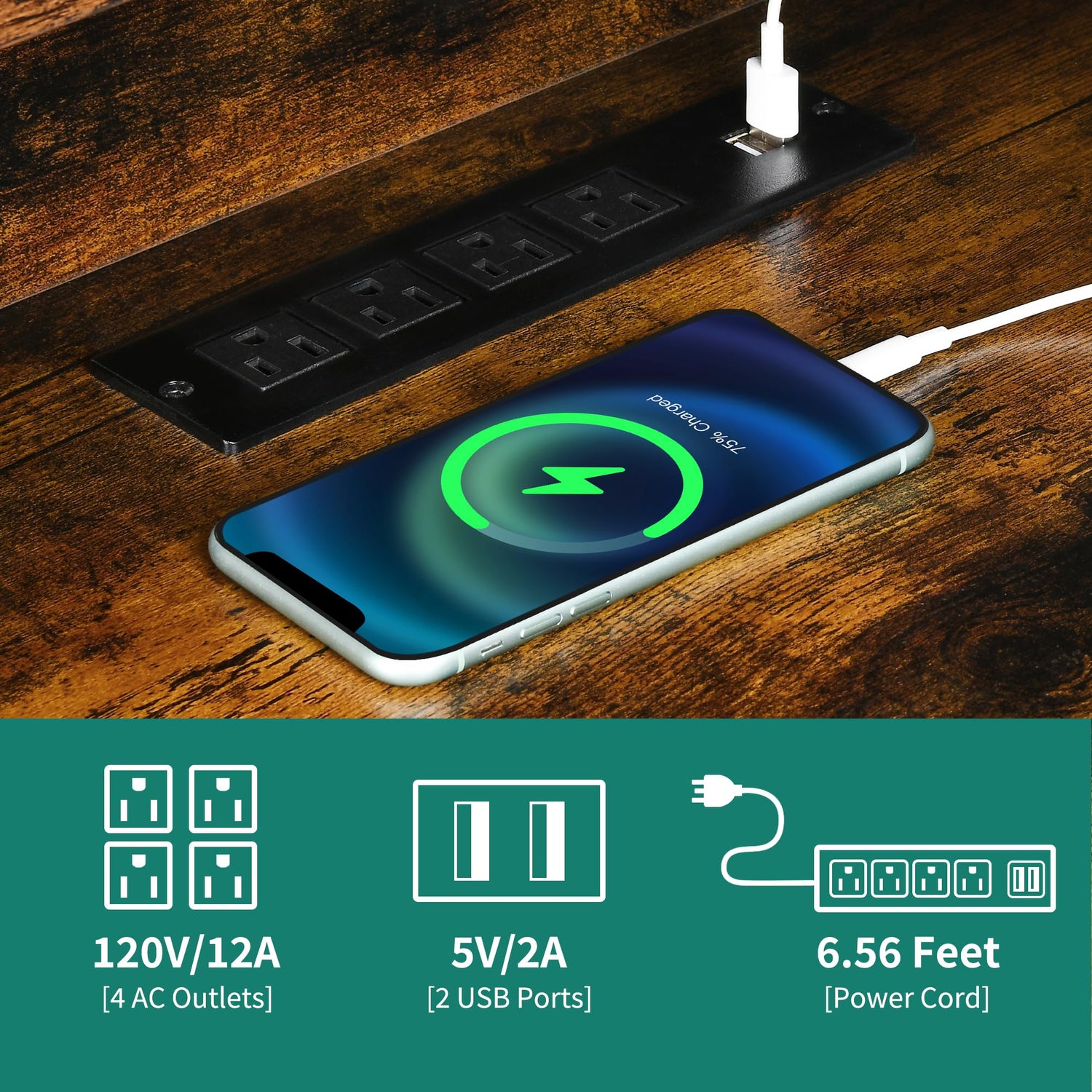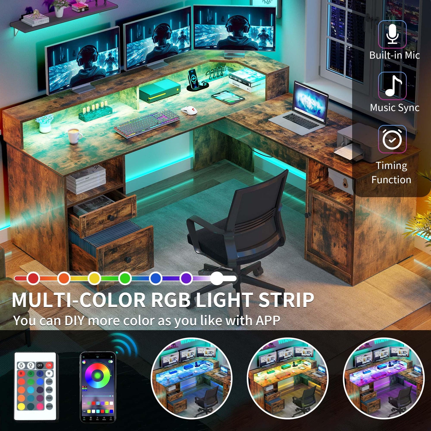 YITAHOME L Shaped Desk with Power Outlets & LED Lights, 60” Corner Computer Desk with Drawers & Lift Top, Home Office Desk with Monitor Stand & File Cabinet, Wood Height Adjustable Desk, Rustic Brown