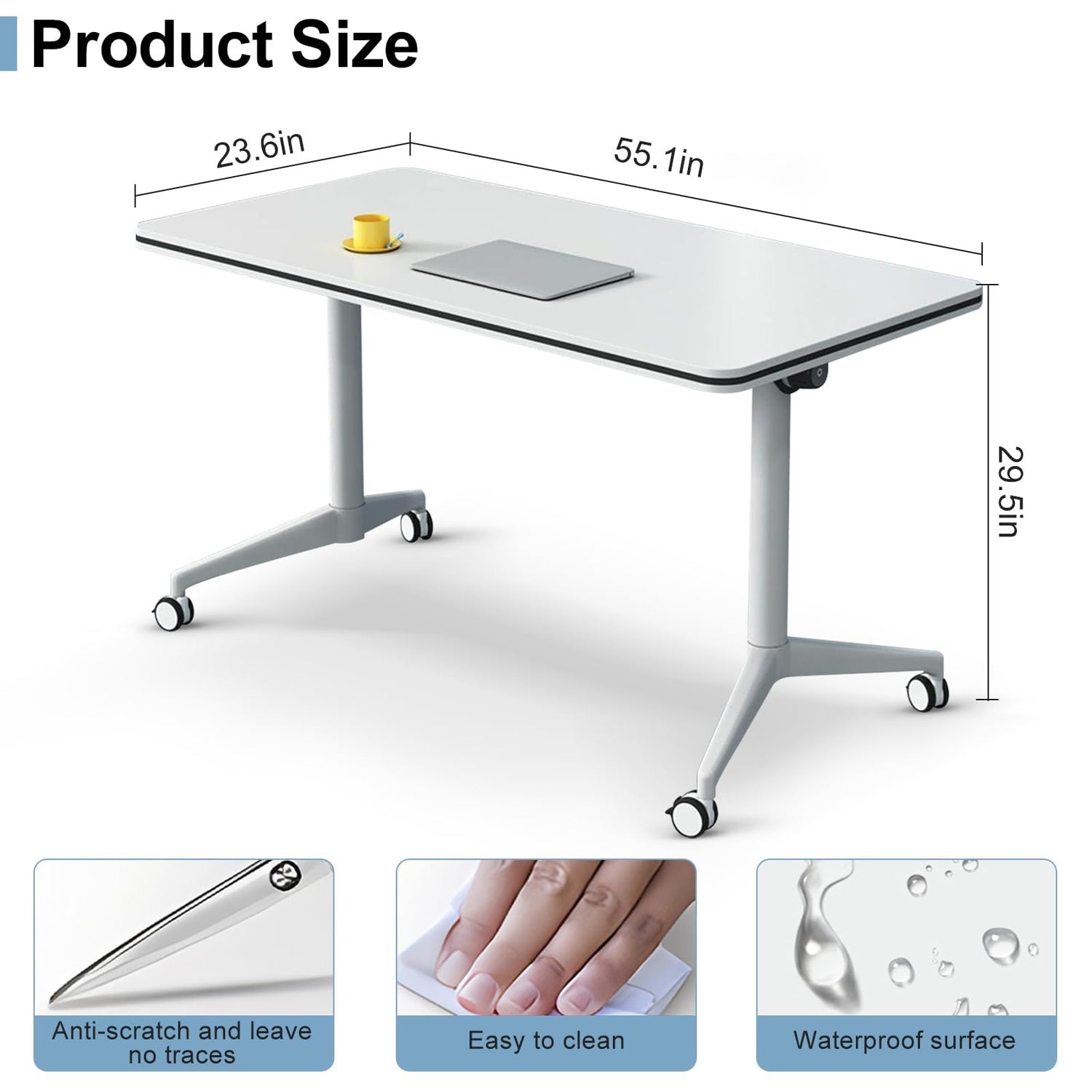 • 【Conference Table】Conference table size: 55x 23.6 x 29.5 Inches (L x W x H). The bottom of the conference table has lockable casters. When you need it, you can put the two tables together to get a large 9ft table for holding meetings or training seminars.