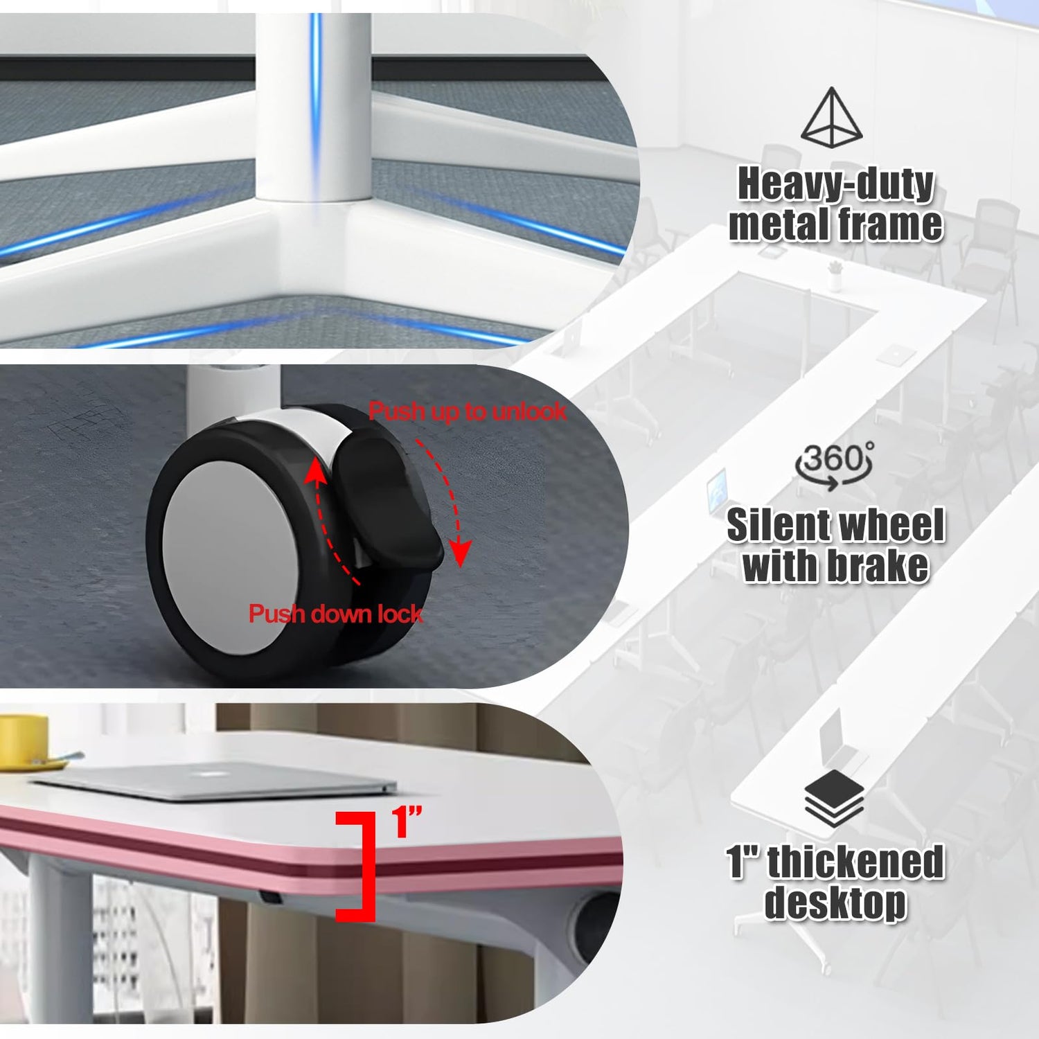 • 【Metal Support Legs】The legs of the conference table are made of metal and have strong load-bearing capacity. With 4 silent wheels on the bottom, you can easily move it anywhere. Just press the brakes on the wheels and the table will not move.