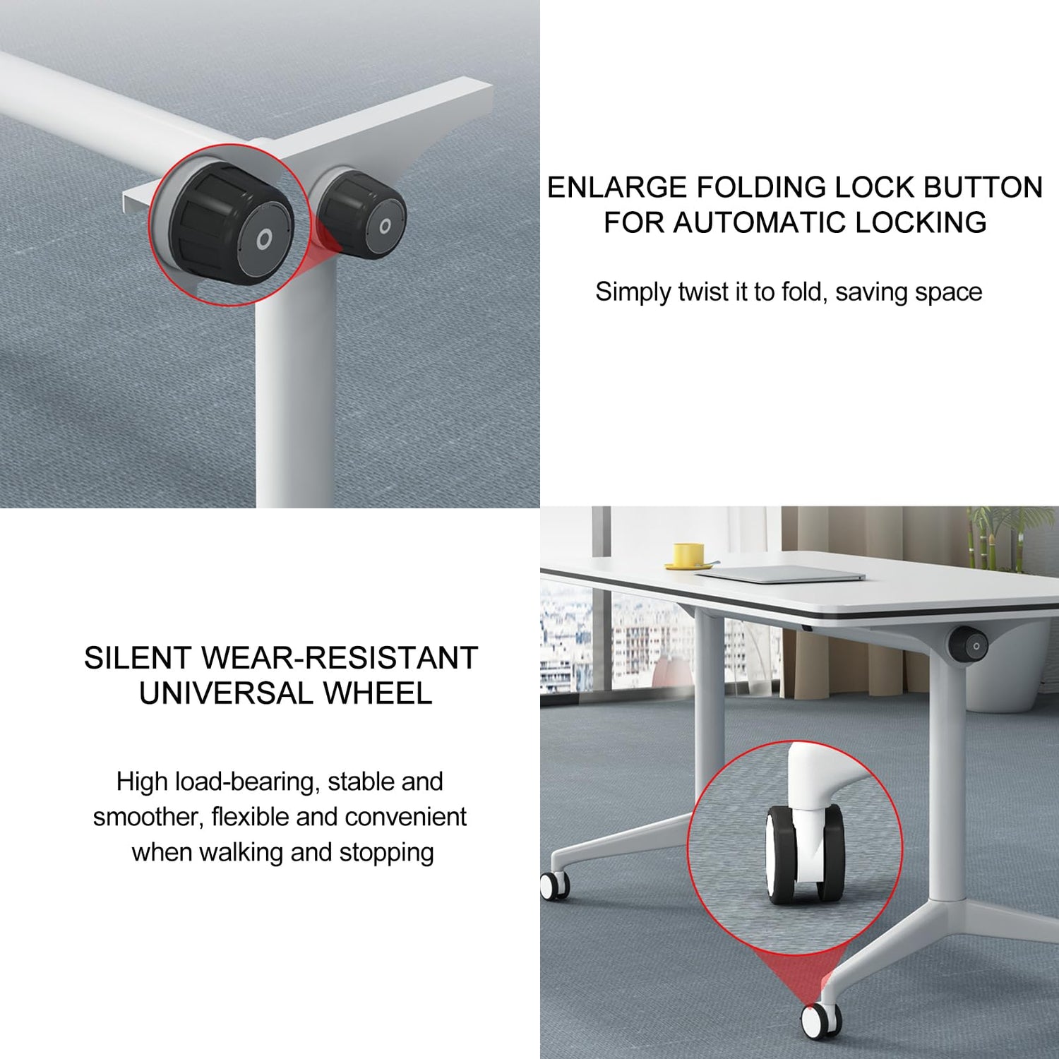 • SILENT UNIVERSAL WHEEL-Each conference table has four casters, which are high load-bearing, stable and smooth. The wheels can rotate quickly and organize office space more efficiently. folding Flip Top Mobile Training Table It is very suitable for different grouping needs and can quickly place the tables together.