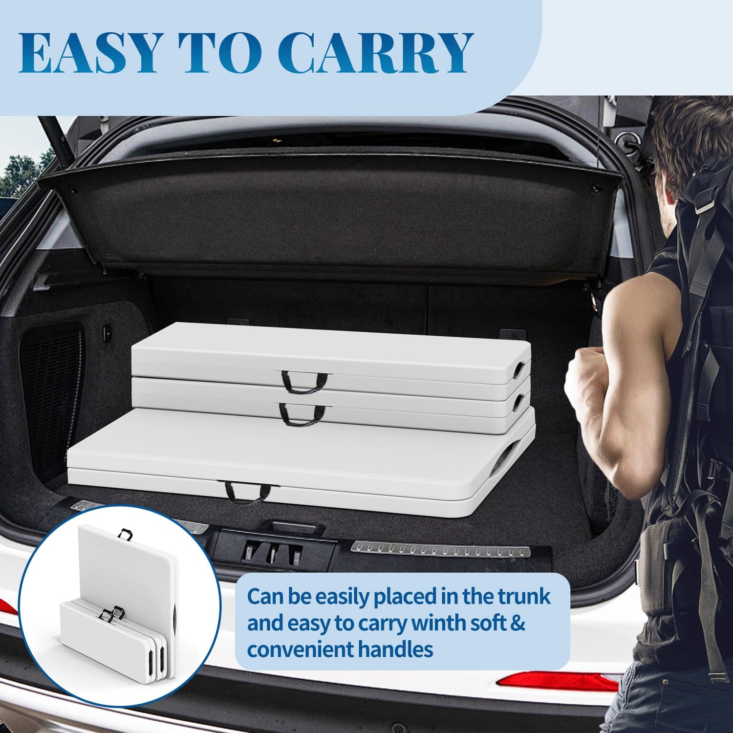Details: 6 Foot Folding Table with 2 Benches, 3-Piece Indoor or Outdoor Folding Table for dining table, camping table, card table, picnic table, beach tables, uses thickened HDPE panels, which is more stable and easy to clean. 6 Feet Camping Table Chair Set with handle, it is easy to carry