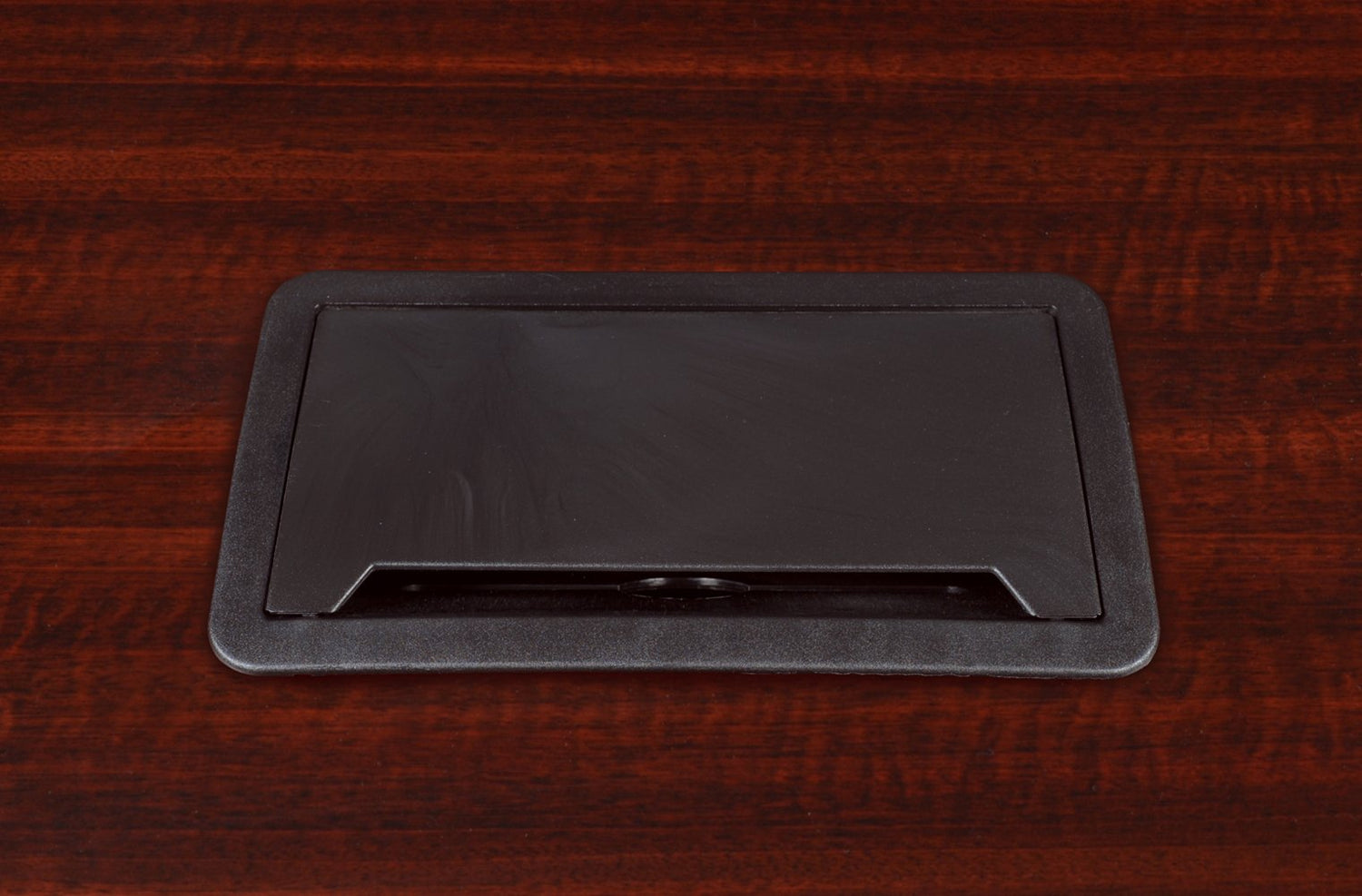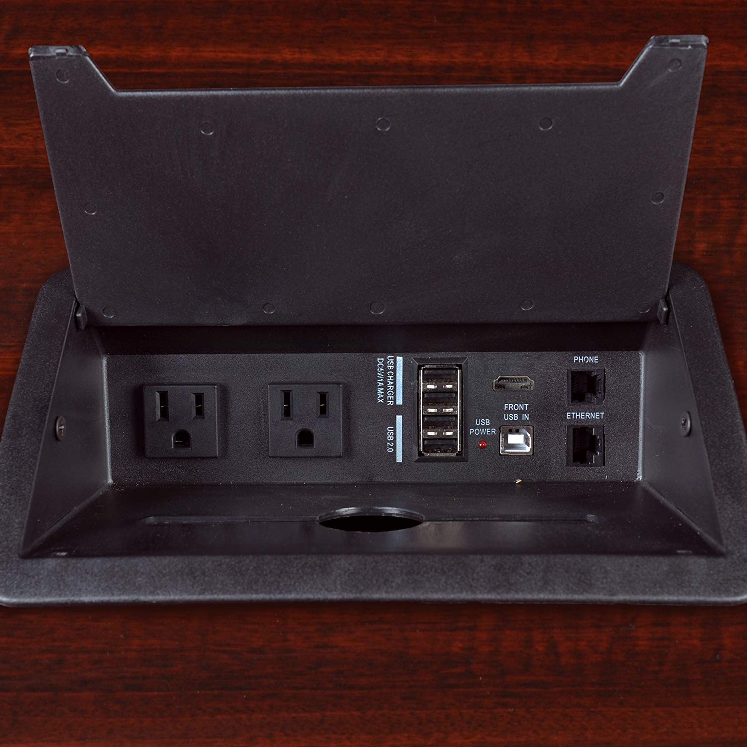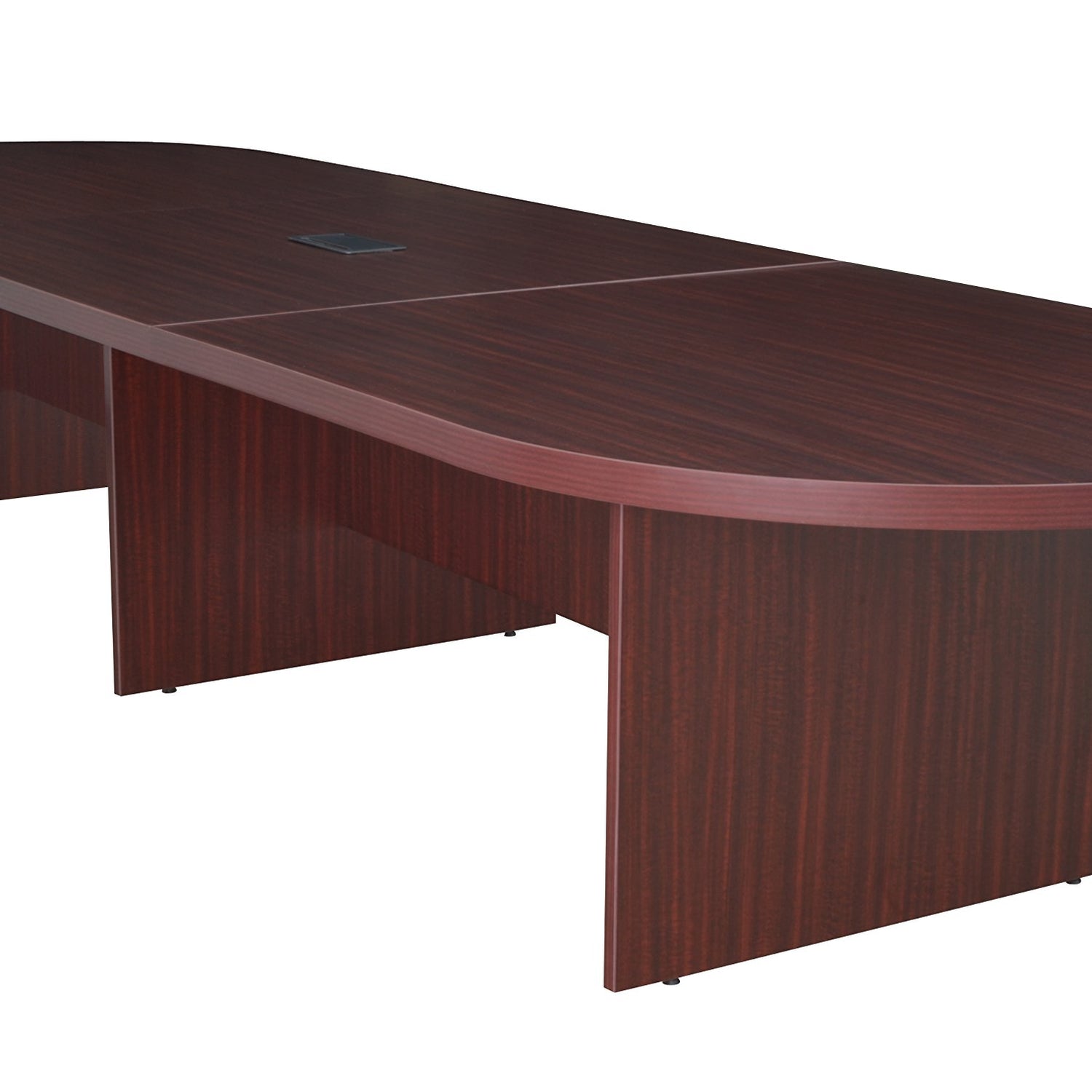 Details: Make presentations memorable with Legacy's Conference collection! Legacy's patented modular conference tables grow with the size of your team. Measuring 12 feet long, this racetrack style table seats 10-12 people and is finished in a classic Mahogany laminate. Adjustable glides on the bottom of the base keep the tabletop level and are easy to adjust. A Power and Data Port makes tabletop connectivity easy. The Power/Data port includes (2) USB 2.0 ports, (2) USB charging ports, (2) AC 125V 60Hz outlets, (1) front/rear ethernet port, (1) front/rear phone port and has a black cover plate for a neat, clean look. The Legacy collection is constructed of a 1-inch thick thermal fused melamine laminate with a 3-millimeter commercial grade matching PVC edge. Laminates are scratch, stain and scald resistant. Legacy casegoods are backed by a 10-year limited manufacturer's warranty.