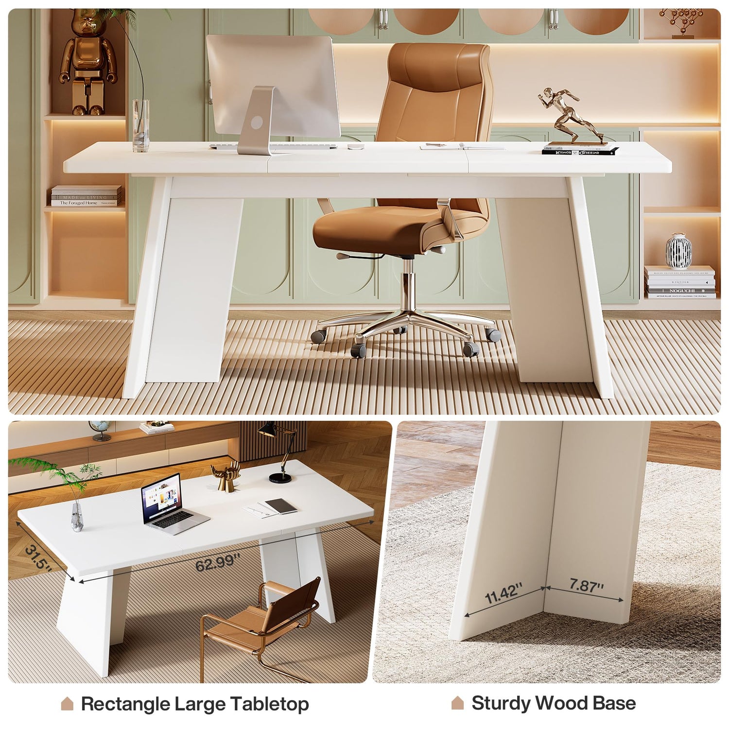 Tribesigns White Executive Desk, 63" Large Office Computer Conference Meeting Table with Wooden Robust Pedestal, Simple Modern Workstation Business Furniture for Home Office