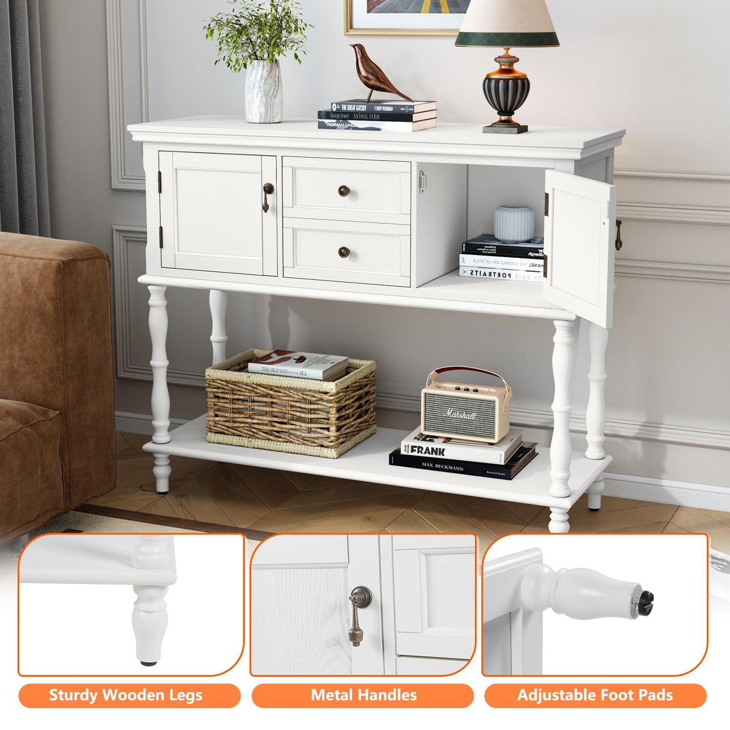 - 【2 drawers & 2 Door Storage Cabinets】This entry table comes with 2 spacious drawers and 2 door storage cabinets, providing ample storage space for your belongings. And the bottom shelf is perfect for placing storage baskets or taller display items as additional storage. Flower bouquets, scented candles, photos, books or other items, everything has the right place to be displayed.