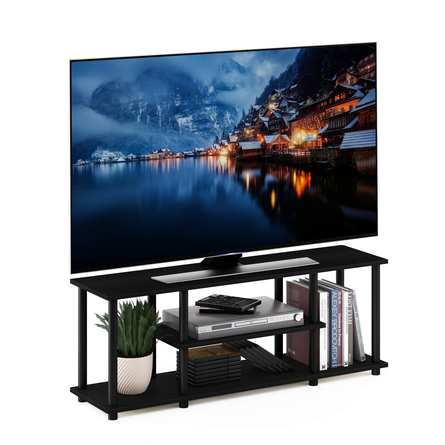 Details: Furinno turn-n-tube series: no tools entertainment TV stand.(1) Unique structure: open display rack, shelves provide easy storage and display of TV or other audio/video accessories. Suitable for any rooms. Designed to meet the demand of low cost but durable and efficient furniture. It is proven to be the most popular RTA furniture due to its functionality, price and the no hassle assembly. (2) smart design: easy assembly and no tools required. A smart design that uses durable recycled PVC tubes and engineered particleboard that withstand heavy weight. Just repeat the twist, turn and stack mechanism and the whole unit can be assembled within 10 minutes. Experience the fun of D-I-Y even with your kids. (3) the particleboard is manufactured in Malaysia and comply with the green rules of production. It is made from 15mm composite wood with PU lamination and 34mm plastic pole. There is no foul smell, durable and the material is the most stable amongst the particle boards. The PVC tube is made from recycled plastic and is tested for its durability. A simple attitude towards lifestyle is reflected directly on the design of Furinno furniture, creating a trend of simply nature. All the products are produced and assembled 100-percent in Malaysia with 95% - 100% recycled materials. Care instructions: wipe clean with clean damped cloth. Avoid using harsh chemicals. Pictures are for illustration purpose. All decor items are not included in this offer.