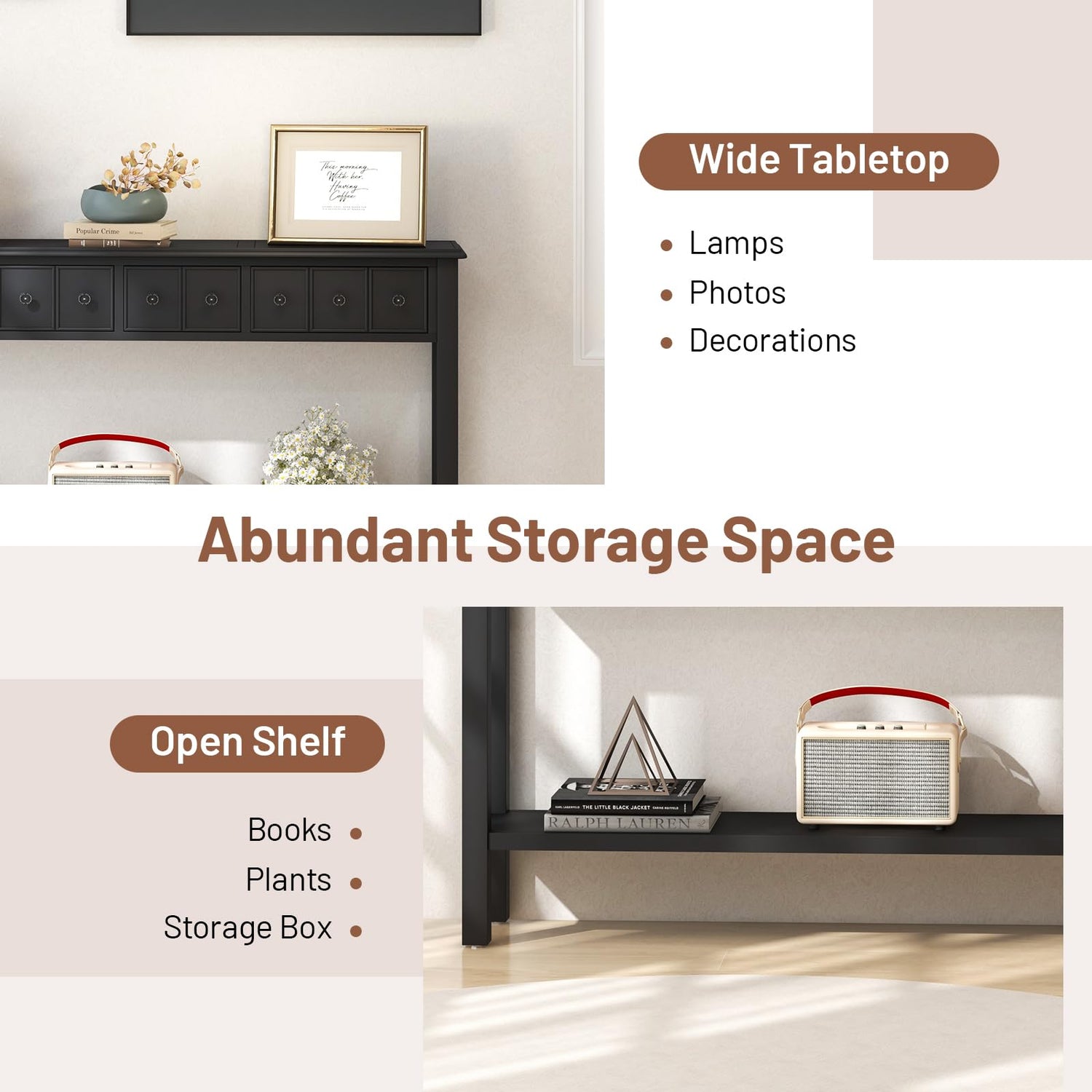Giantex Narrow Console Table with Storage - 60" Long Sofa Side Table w/ 4 Drawers & Open Shelf, Solid Wood Legs, Rectangular Entry Table, Retro Entryway Table for Living Room Hallway, Foyer, Black