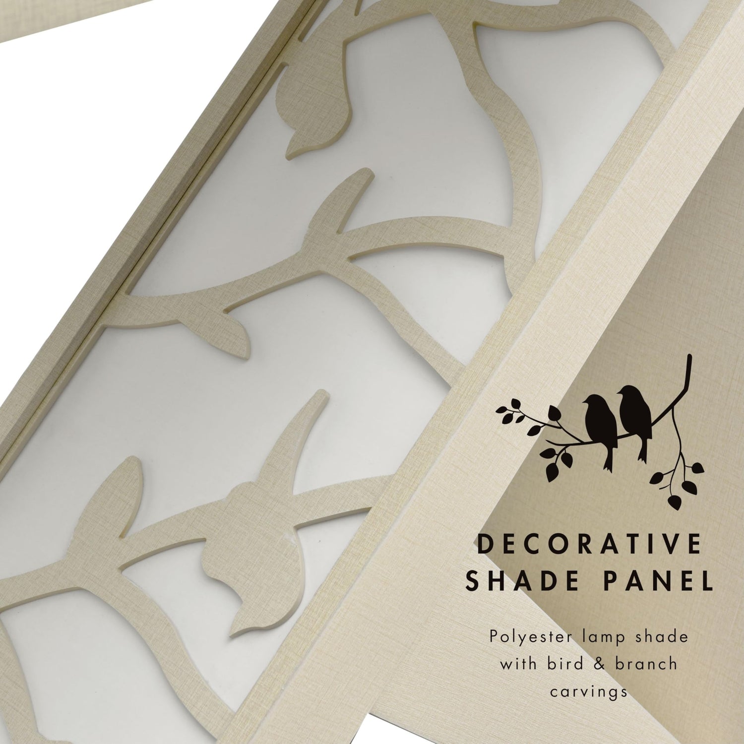 The polyester lamp shade features intricate bird and branch carvings, while the stamped wood shade cover adds a touch of elegance.