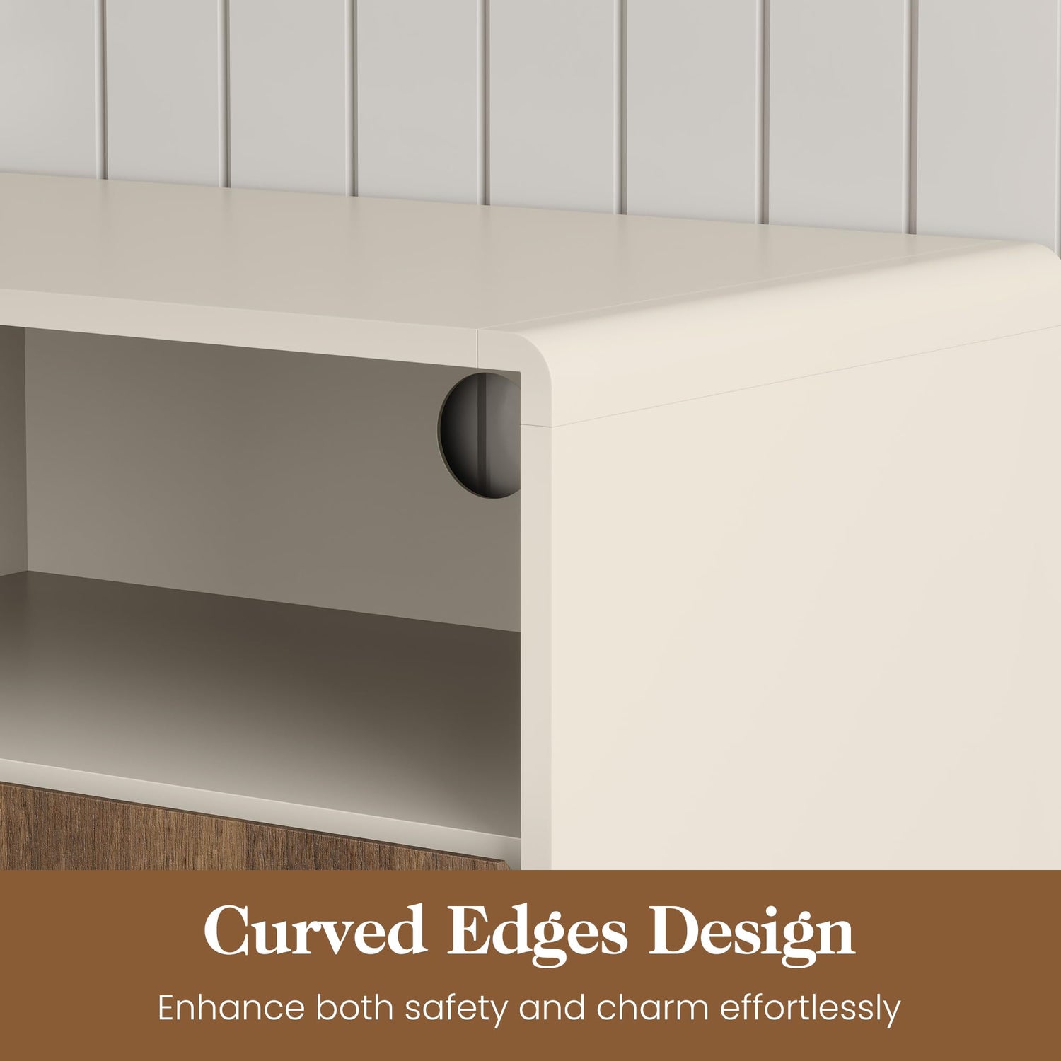 - Artistic Curved Design: With its gracefully curved edges, this Television stand exudes sophistication and visual allure, elevating the aesthetics of your room. Beyond its stylish appearance, the curved design enhances safety by reducing the risk of injuries during activity around the cabinet.
