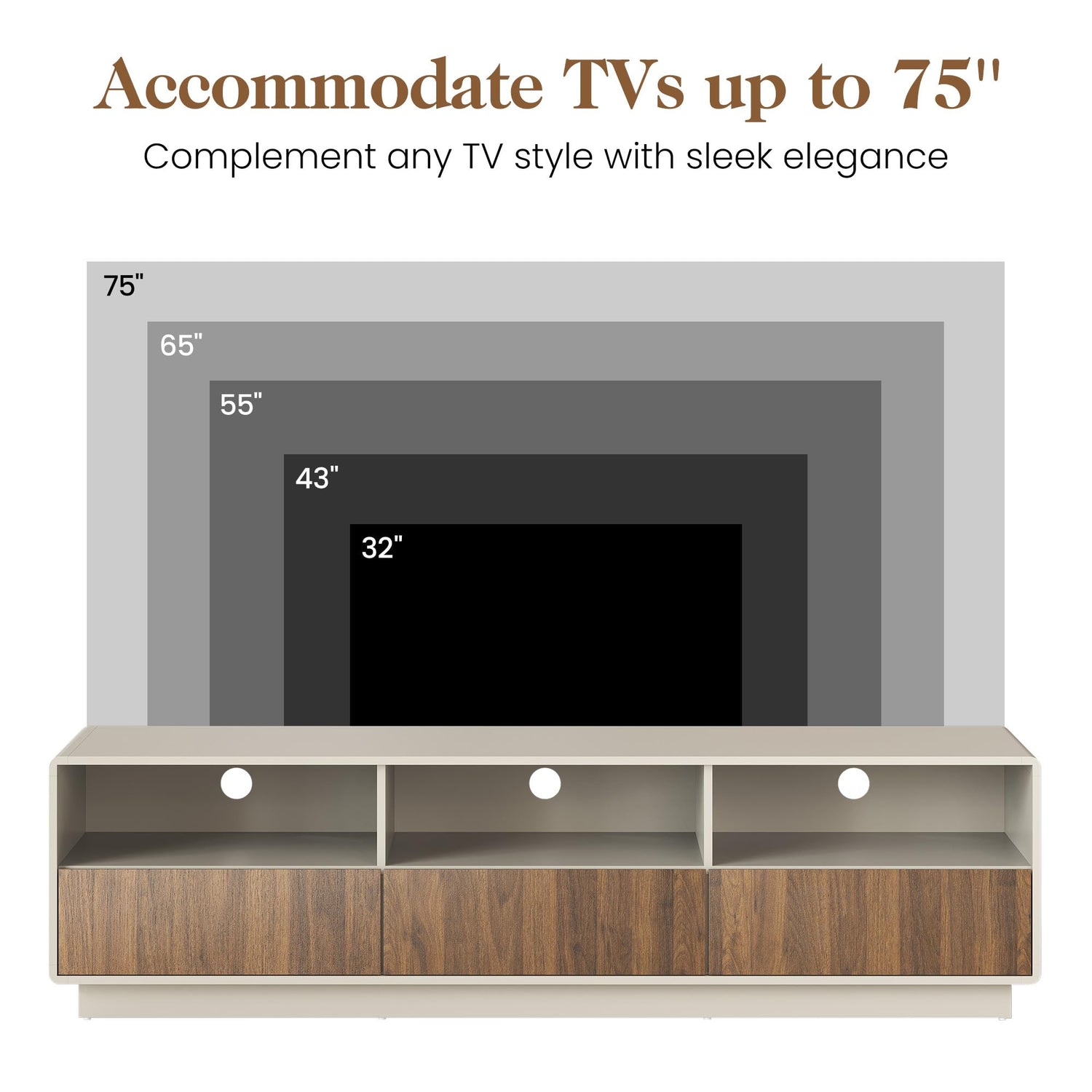 - Modern TV Cabinet: Elevate your living space with this luxurious TV console, featuring a stylish combination of milky white and walnut wood tones. Its minimalist design exudes personality and aesthetic charm, capable of accommodating TVs ranging from 30 to 75 inches. If you like a higher watching, wall-mount your TV and use the cabinet to showcase decorative items.