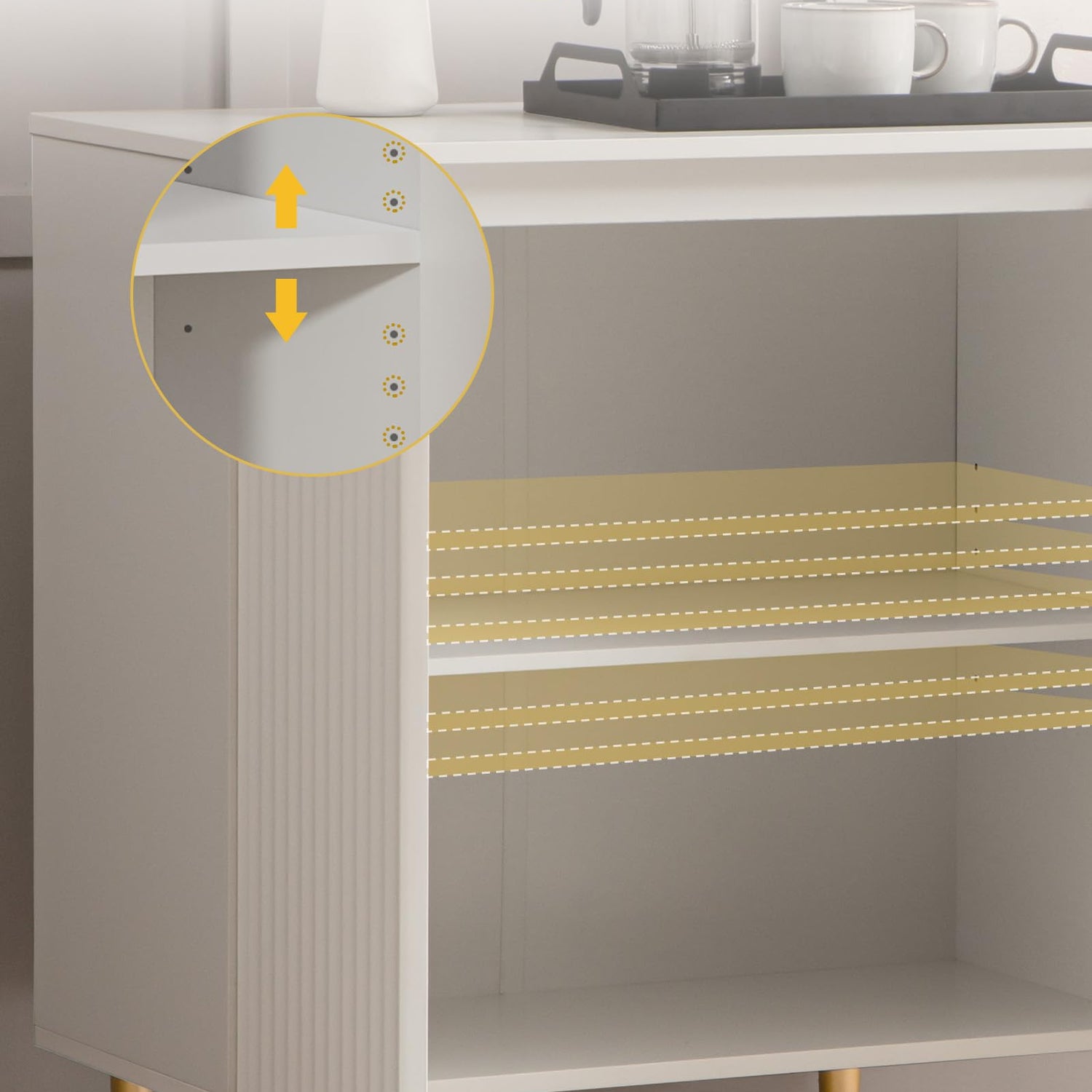 - Tip: If the doors are not level or have a gap after assembly, please refer to the instructions or the video on the product detail page to adjust the hinge screws inside the coffee bar cabinet.